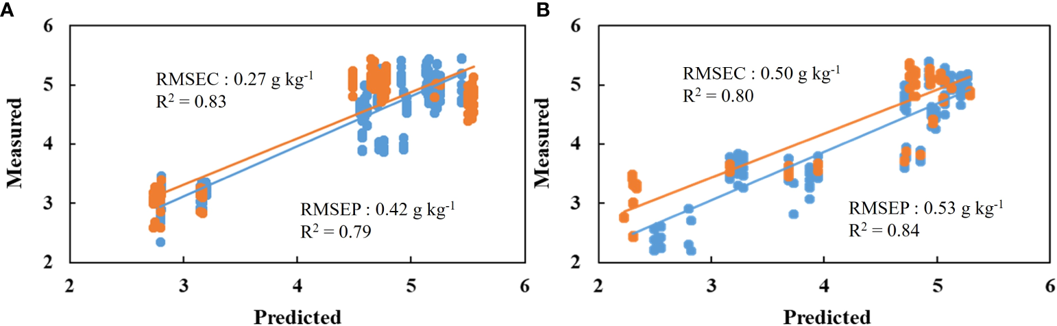 Measured vs. predicted scores of tannin content (g kg-1) for ‘Cheongdo-Bansi’ (A) and ‘Daebong’ (B) in the calibration (blue) and prediction (red) sets with multivariate PLS models using firmness and simple sugars values. The scatter plot depicts the prediction accuracy of the model. The x axis represents the predicted value of tannin content and the y axis represents the measured value by the multivariate PLS models.