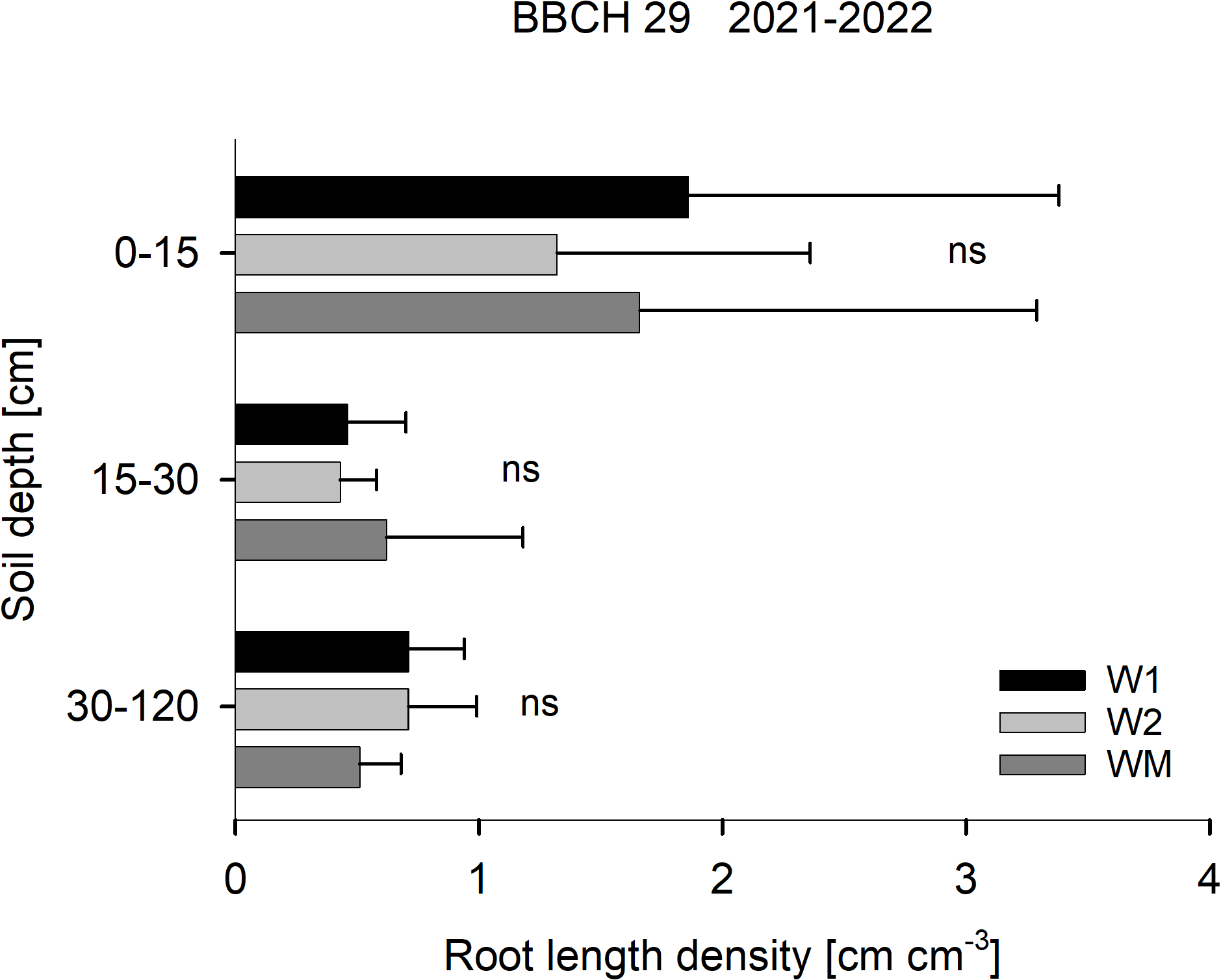 Effect of the crop rotational position of winter wheat (W1 = first wheat after oilseed rape, W2 = second wheat after oilseed rape, WM = wheat monoculture) on root length density in three soil depths at BBCH 29 in Harste, data from 2021 and 2022, n = 12. Bars show means with standard deviation, ns, not significant (p ≥ 0.05).