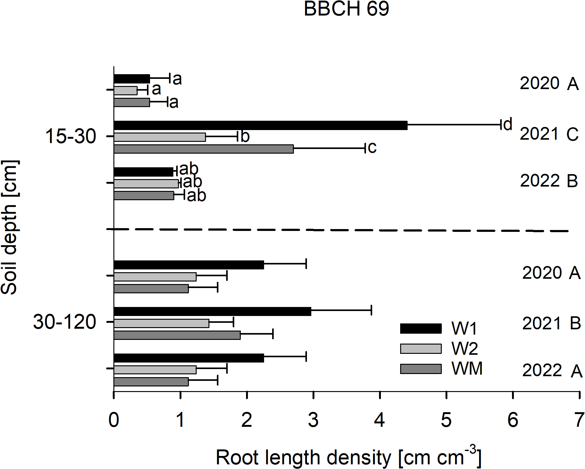 RLD at BBCH 29 was not affected by the crop rotational position (Figure 2), RLD in 15–30 cm soil depth at BBCH 69 varied significantly with W1 > WM > W2 in 2021, while no significant differences were found in 2020 and 2022 (Figure 3). In 30–120 cm soil depth at BBCH 69, RLD varied significantly with W1 (0.7 ± 0.3 cm cm−3) > WM (0.5 ± 0.2 cm cm−3) and W2 (0.4 ± 0.1 cm cm−3) across all study years (Figure 3). For all BBCH stages and soil depths, RLD varied significantly with 2021 > 2022 and, if sampled, 2020 (BBCH 29: data not shown, BBCH 69: Figure 3).