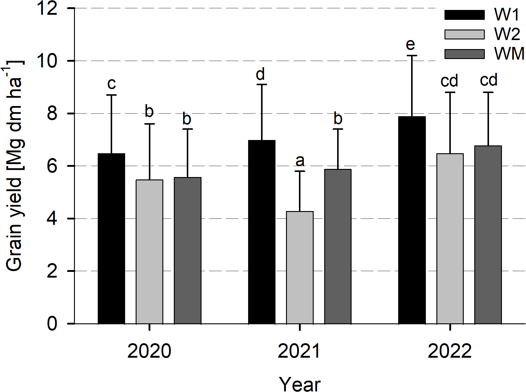 | Thousand grain weight [g] | 2020 | 45 (1) d | 43 (2) c | 43 (1) c | |