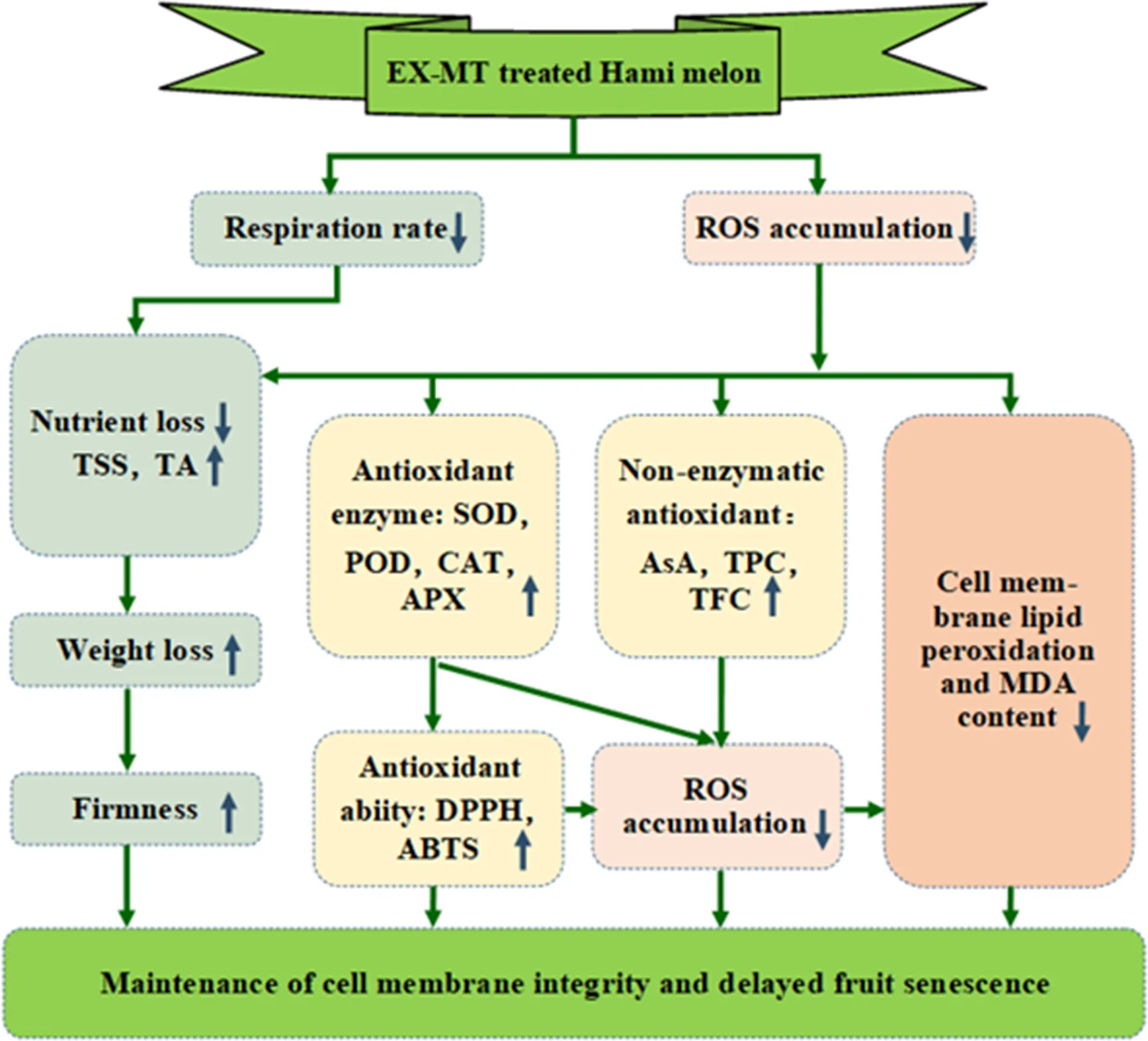 After melatonin treatment, the respiratory rate and ROS accumulation of Hami melon were inhibited. Lower respiratory rate can reduce nutrient loss, and maintain higher levels of TSS and TA, which helps delay the loss in fruit firmness and weight. In addition, ROS accumulation can activate the antioxidant system, leading to an increase in antioxidant enzymes and substances. This helps to enhance the antioxidant capacity of the fruit, which in turn acts on ROS and inhibits accumulation of ROS. Excessive ROS can accelerate membrane lipid peroxidation and MDA production, leading to membrane lipid damage and fruit senescence. MT treatment maintained the cell membrane integrity and delayed fruit senescence. Notes: EX-MT, exogenous melatonin; ROS, reactive oxygen species; TSS, total soluble solid content; TA, titratable acid content; SOD, superoxide dismutase; POD, peroxidase; CAT, catalase; APX, ascorbate peroxidase; AsA, ascorbic acid; TPC, total phenols content; TFC, total flavonoids content; MDA, malondialdehyde; DPPH, 1,1-diphenyl-2-picrylhydrazyl; ABTS, 3-ethylbenzthiazoline-6-sulfonic acid.
