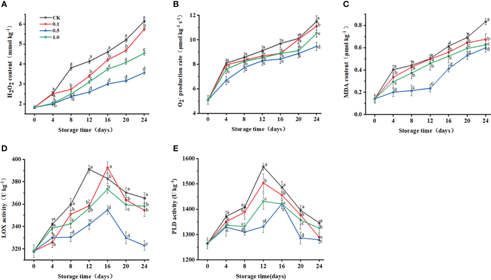 MDA content is an important indicator of the degree of peroxidation in plant cells (Yang et al., 2021). In this study, MDA content for the control and MT groups gradually increases to a maximum at the end of storage (Figure 2C), while the 0.5 MT group shows the lowest value (0.6 μmol kg−1) at 24 d.