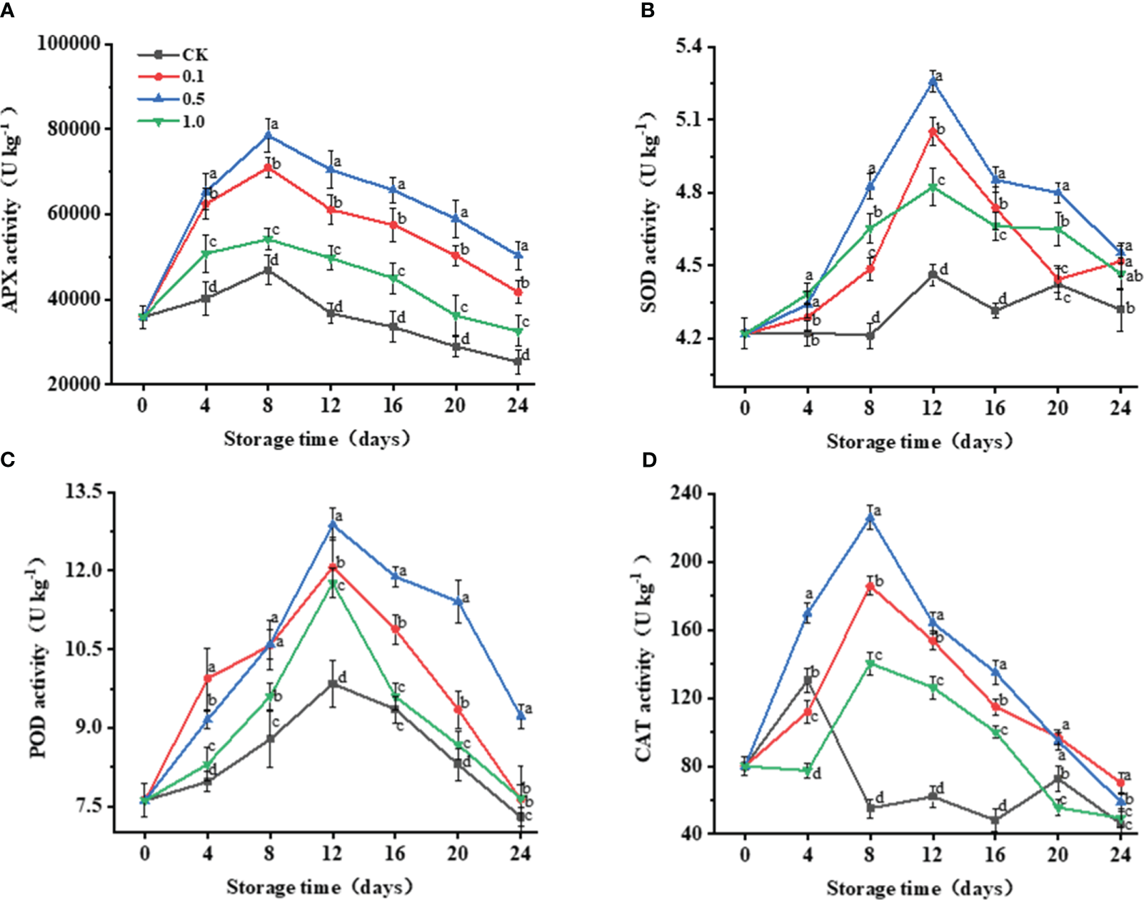 Changes of melatonin treatments on antioxidant enzyme activities of Hami melon fruit (57 per group) during storage at 6 ± 1°C. (A) APX, ascorbate peroxidase; (B) SOD, superoxide dismutase; (C) POD, peroxidase; (D) CAT, catalase. A total of 228 Hami melons were divided into four groups (n=57/group). All values are means ± standard error. Error bars represent the standard error of the means. Values followed by different superscripts (a-d) are significantly different in the same sampling time (p< 0.05).