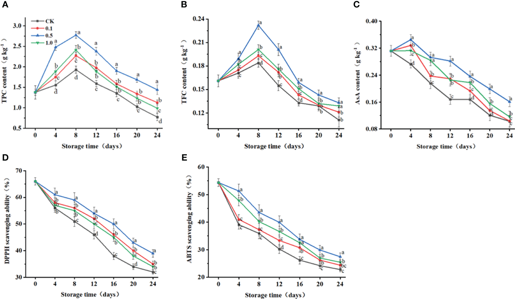 Unlike the continuously decreasing trend for the control group, AsA contents for the MT groups first increase during days 0–4 and then decrease for days 4–24 (Figure 4C). At 24 d, the AsA content in the control group is decreased by 67.0%, while those for the 0.1, 0.5 and 1.0 MT groups are decreased by 66.7%, 48.4%, and 62.7%, respectively.