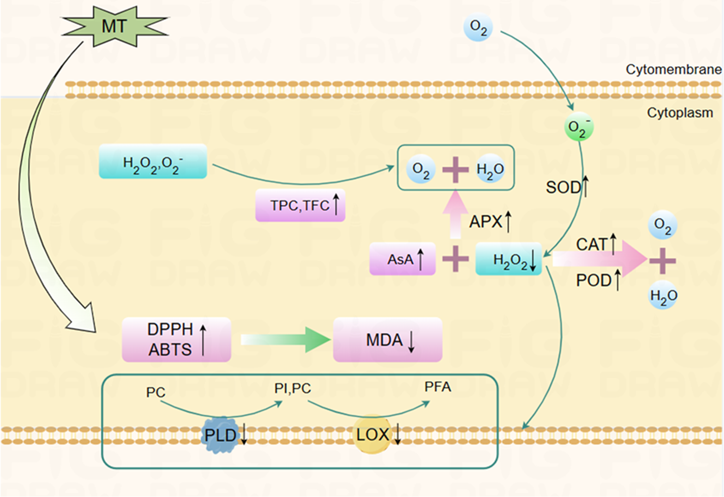 The possible mechanism by which melatonin treatment delays postharvest senescence of Hami melons. After melatonin treatment, SOD, POD, CAT, APX activities, ASA, TPC, TFC content, DPPH, ABTS free radical scavenging ability of Hami melon fruits were enhanced, while PLD, LOX activity, and MDA content were decreased. MT, melatonin; TPC, total phenols content; TFC, total flavonoids content; APX, ascorbate peroxidase; SOD, superoxide dismutase; POD, peroxidase; CAT, catalase; AsA, ascorbic acid; DPPH, 1,1-diphenyl-2-picrylhydrazyl; ABTS, 3-ethylbenzthiazoline-6-sulfonic acid; LOX, lipoxygenase; PLD, phospholipase D; MDA, malondialdehyde; PC, phosphatidylcholine; PI, phosphatidylinositol; PFA, phospholipid fatty acid.