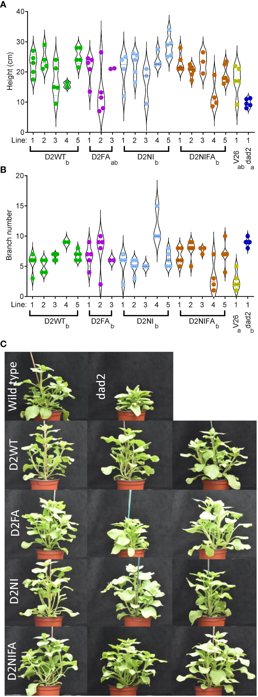 Phenotypic analysis of mutant petunia plants (dad2) transformed with various DAD2 (wild type and mutant) genes expressed from the CaMV 35S promoter. D2WT = wild type CDS, D2FA = F135A mutation, D2NI = N241I mutation, D2NIFA = N242I and F135A mutations. An untransformed wild type (V26) and mutant line (dad2) are shown for comparison. Graphs are violin plots with median and quartiles indicated, points are individual data. n = 2–6. Within each graph genotypes that share a lowercase identifier are not significantly different by Tukey’s LSD tests (α = 0.05). (A), height of the plants. (B), number of branches longer than 2 cm. (C), images of plants from the experiment in (A, B). The top row are the control wild type and dad2 lines. The remaining rows show plants from three different transgenic lines for each construct in the dad2 background.