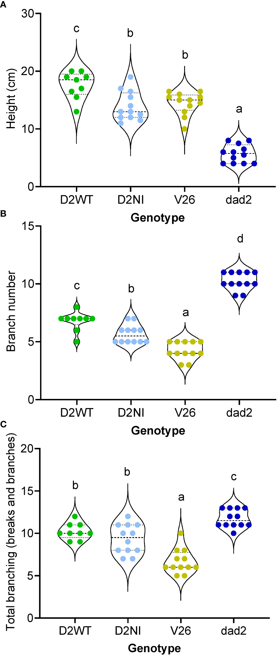 Phenotypic analysis of mutant petunia plants (dad2) transformed with D2WT = DAD2 wild type CDS, and D2NI = DAD2 with the N241I mutation. An untransformed wild type (V26) and mutant line (dad2) are shown for comparison (n= 9–12). The measurements were made at 51 days post sowing. Graphs are violin plots with median and quartiles indicated, points are individual data. Within each graph data with the same lowercase identifier are not significantly different by Fisher’s protected least significant difference tests (A), height of the plants. (B), number of branches longer than 2 cm. (C), number of axillary buds with at least two leaves.