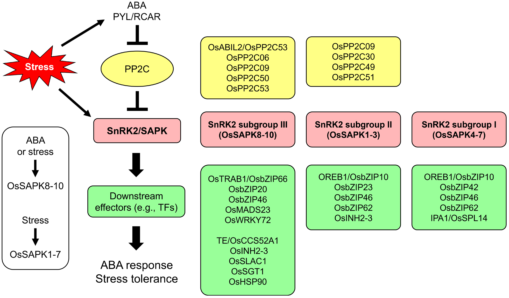 ABA signaling cascade and signaling components associated with OsSnRK2. SNF1-related protein kinase 2 (SnRK2)/Stress-activated protein kinase (SAPK) is a core regulator of ABA signaling and abiotic stress responses in plants. For the ABA response, the ABA receptor PYL/RCAR (Pyrabactin-resistance like/Regulatory component of ABA receptors) inactivates the type 2C protein phosphatase (PP2C), which is a negative regulator of SnRK2. Activated SnRK2 phosphorylates effectors including transcription factors to transfer the signal downstream. In rice, all OsSAPKs are activated by hyperosmotic stress, but only OsSAPK8–10 (belonging to subgroup III) are activated by ABA (Kobayashi et al., 2004). Many studies have identified various regulators of OsSAPK-mediated ABA signaling. This figure shows the signaling components known to be associated with the different OsSnRK2 subgroups.