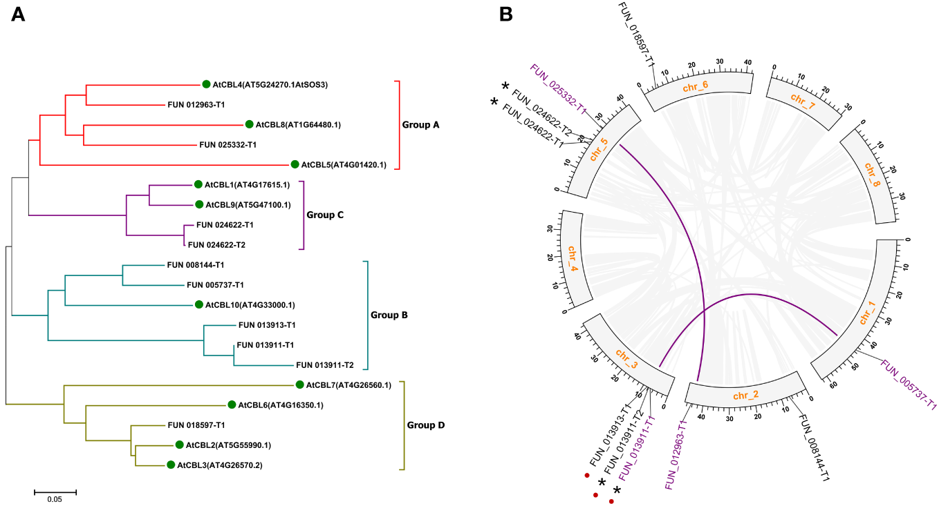 In plants, the Ca2+ signals are detected by different types of Ca2+-binding sensors. These include calmodulin (CaM), CaM-like (CML) proteins, calcineurin B-like (CBL) proteins, Ca2+-dependent protein kinases (CDPKs), and calcium/CaM-dependent protein kinase (CCaMK) (Poovaiah and Du, 2018). The CBL family, resembling the calcineurin B subunit of yeast and animal cell protein phosphatases, possesses four elongation factor (EF)-hand motifs that can bind up to four Ca2+ molecules (Kudla et al., 1999; Nagae et al., 2003; Sanchez-Barrena et al., 2005). Studies across plant species highlight CBLs’ significant role in responding to adverse environments. In Arabidopsis, 10 CBL proteins, grouped based on their phylogenetic relationship, subcellular localization, and function, have been identified (Kolukisaoglu et al., 2004). The CBL family’s characterization extends to various plant species, including Populus euphratica (Zhang et al., 2008), Vitis vinifera (Xi et al., 2017), and Solanum melongena (Li et al., 2016).