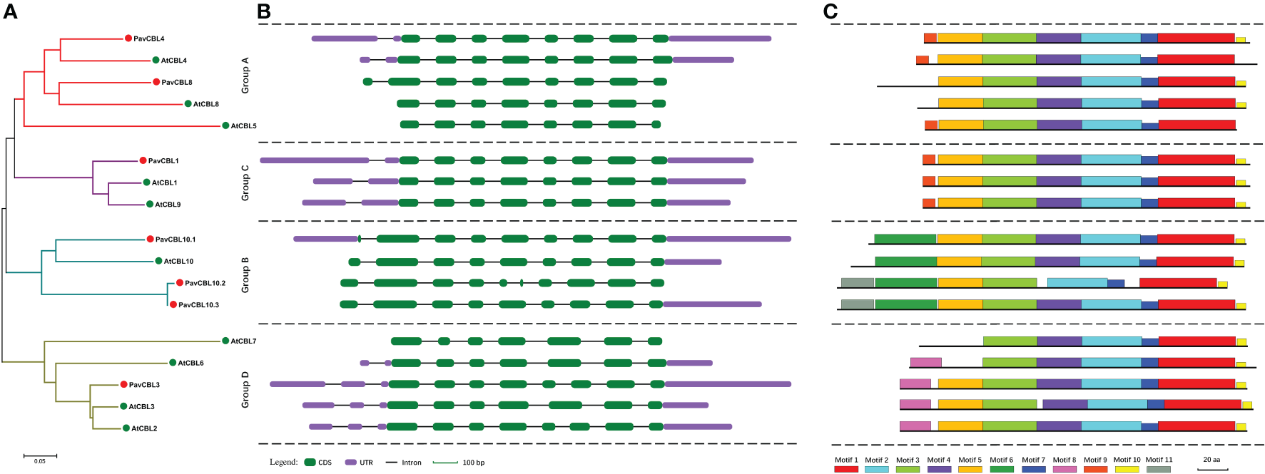 To enhance comprehension of the correlation amongst PavCBL proteins, we constructed a phylogenetic tree with seven PavCBLs and ten AtCBLs (Figure 2A). Results showed that PavCBLs formed four clusters, akin to observations in Arabidopsis (Figure 2A). Analyzing PavCBL gene structures indicated significantly diverse intron lengths (Figure S3) and noticeable N-terminal variation among distinct groups, yet genes clustered within the same branch shared similar exon-intron patterns (Figures 2A, B). Utilizing MEME software, we also predicted conserved motifs in PavCBLs, with motifs 1, 2, 3, and 7 evident across all proteins (Figures 2C; S4). However, motif 4 was absent in PavCBL10.2, where an analysis revealed a missing fragment in its fifth exon (Figure 2B). Additionally, motifs 6 and 8 exclusively appeared in groups B and D, respectively, while motif 9 was solely present in groups A and C (Figures 2A, C). These outcomes imply the potential utility of these motifs in differentiating CBL proteins among distinct groups.