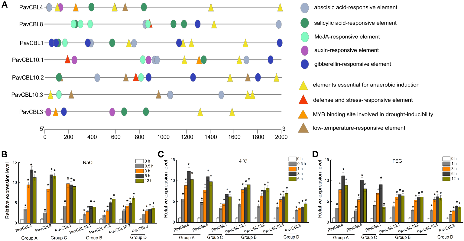 Promoter analysis and expression profile of PavCBL genes. (A)Cis-element analysis of the PavCBL genes promoter regions. Circles and triangles indicate the cis-elements related to hormone response and abiotic stress response, respectively. (B–D) Expression patterns of the PavCBL genes in leaves of ‘Gisela 6’ plants under NaCl (B), cold (C), and PEG (D) treatments. The expression level was calculated with respect to control samples (0 h) with the 2—△△CT method. * in each panel indicates signifcant differences from the control at P < 0.05.