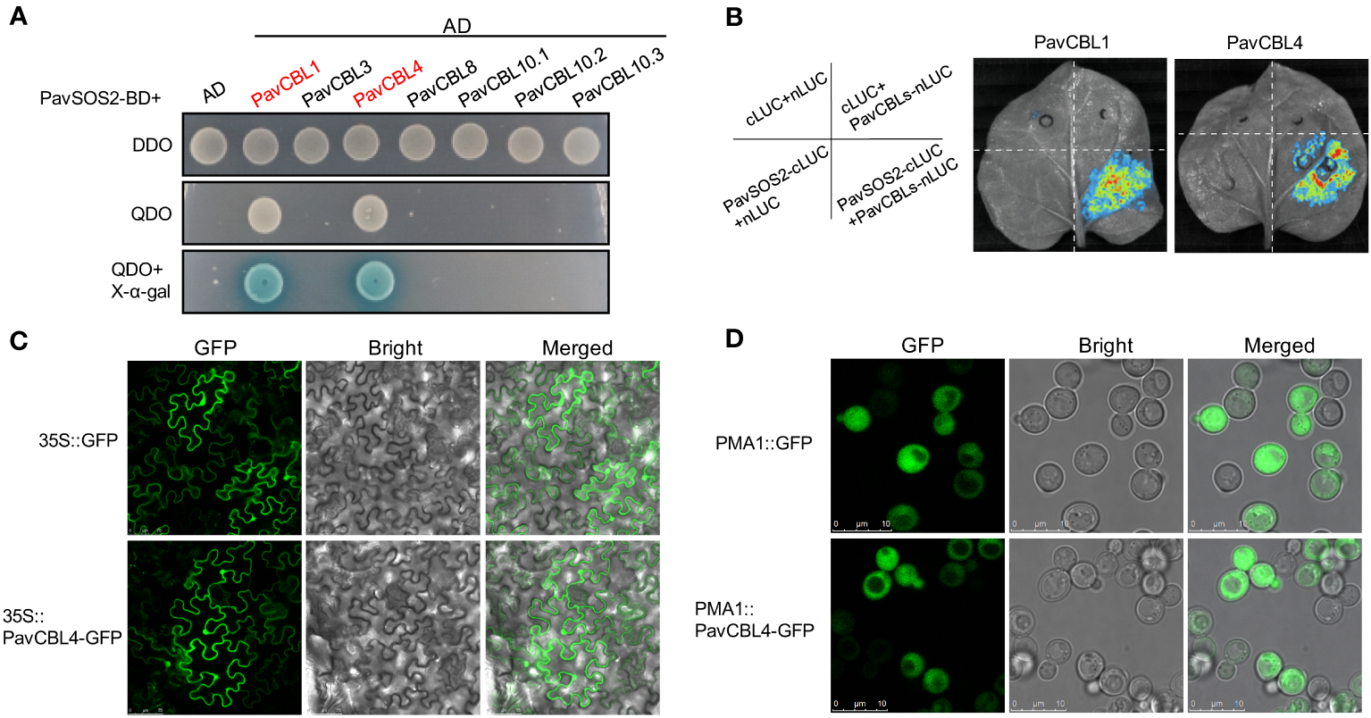 Protein interaction identification between PavCBLs and PavSOS2 and subcellular localization of PavCBL4. (A) Identification of the protein interactions between PavCBLs and PavSOS2 through yeast-two-hybrid (Y2H) assays. AD, pGADT7; BD, pGBKT7. DDO, SD medium without leucine and tryptophan; QDO, SD medium without leucine, tryptophan, histidine, and adenine. (B) Identification of the protein interactions between PavCBL1/PavCBL4 and PavSOS2 through the Split-LUC assays. (C) Subcellular localization of PavCBL4 in epidermal cells of tobacco leaves. Scale bars, 75 μm. (D) Subcellular localization of PavCBL4 in yeast cells. Scale bars, 10 μm.