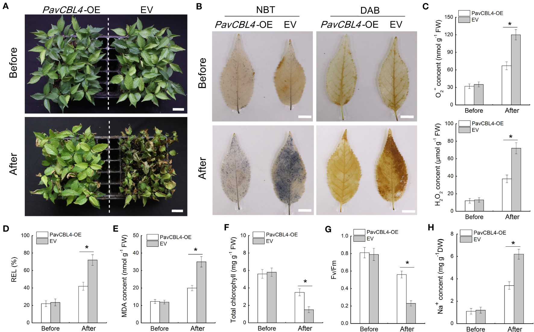 Phenotypic analysis of PavCBL4-overexpressing transgenic ‘Gisela 6’ plants under NaCl treatment. (A) Growth phenotypes of ‘Gisela 6’ plants before and after NaCl treatment. (B)In situ accumulation of H2O2 and O2. - detected by DAB and NBT histochemical staining, respectively. (C) H2O2 and O2. - contents in leaves of ‘Gisela 6’ plants. (D-H) Relative electrolyte leakage (REL) (D), malondialdehyde (MDA) content (E), total chlorophyll content (F), Fv/Fm ratio (G), and Na+ content (H) in leaves of ‘Gisela 6’ plants. * in each panel indicates signifcant differences from the control at P < 0.05.