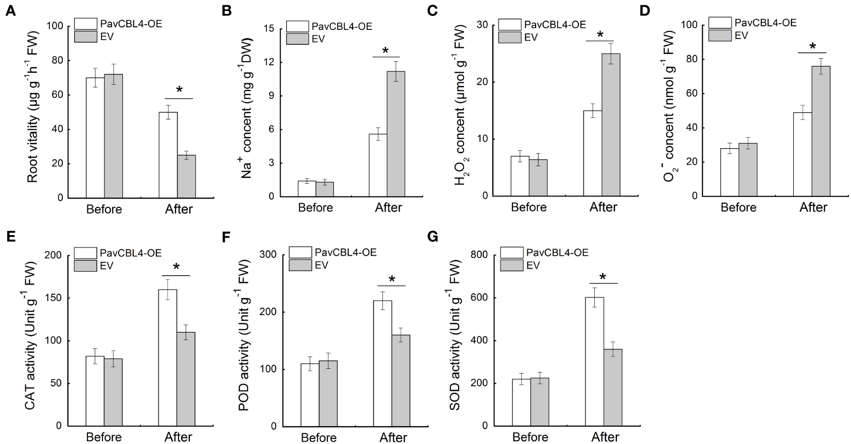 PavCBL4 overexpression inhibits Na+ and ROS accumulation and promotes antioxidant enzyme activities in roots. (A) Root vitality of ‘Gisela 6’ plants. (B) Na+ content in roots. (C, D) H2O2 and O2. - contents in roots of ‘Gisela 6’ plants. (E–G) Enzymatic activity of CAT, POD, and SOD antioxidant enzymes. * in each panel indicates signifcant differences from the control at P < 0.05.