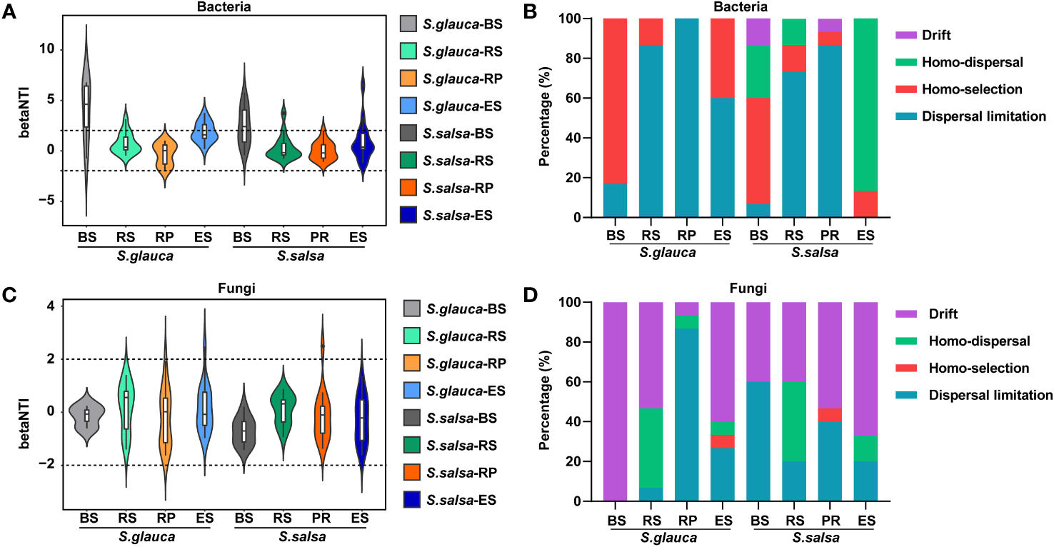 Deterministic or stochastic processes in bacterial (A, B) and fungal (C, D) communities of two plants among four compartments.