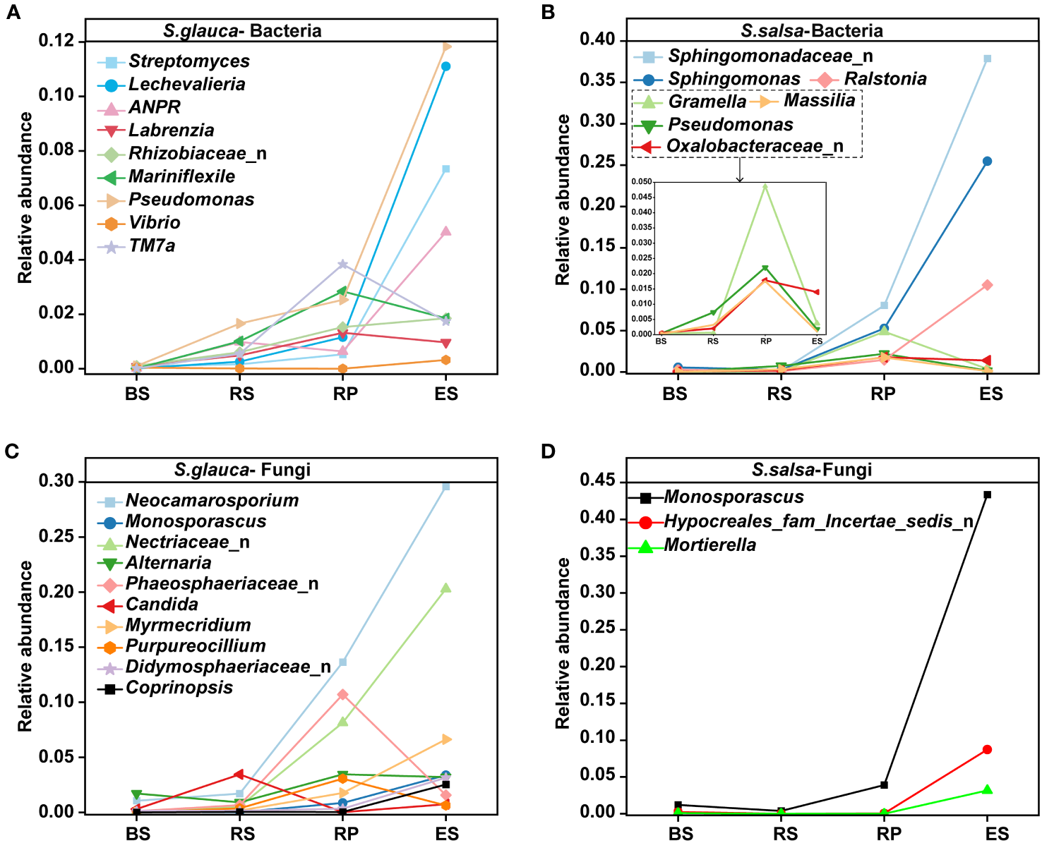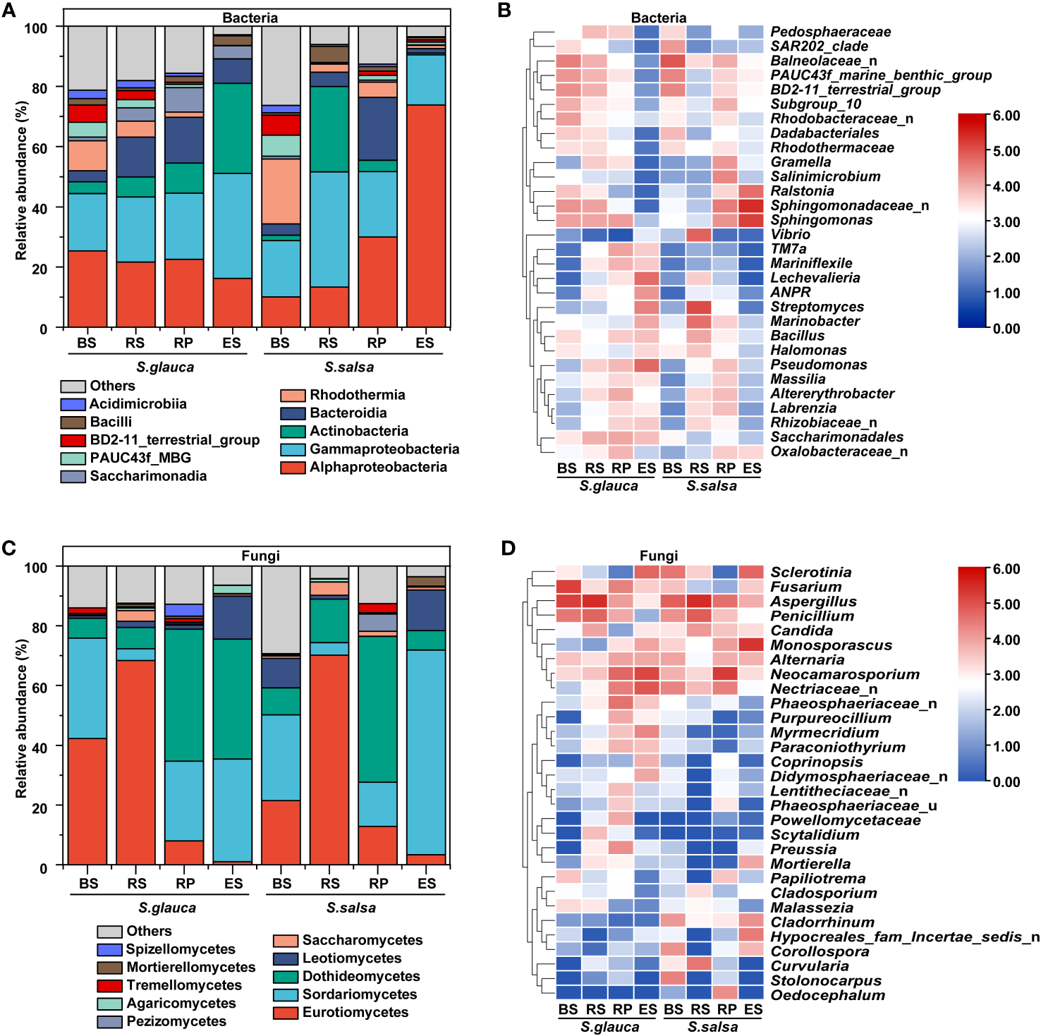 Changes in the relative abundances of dominant bacterial (A, B) and fungal (C, D) genera in different niches of S. glauca and S. salsa.