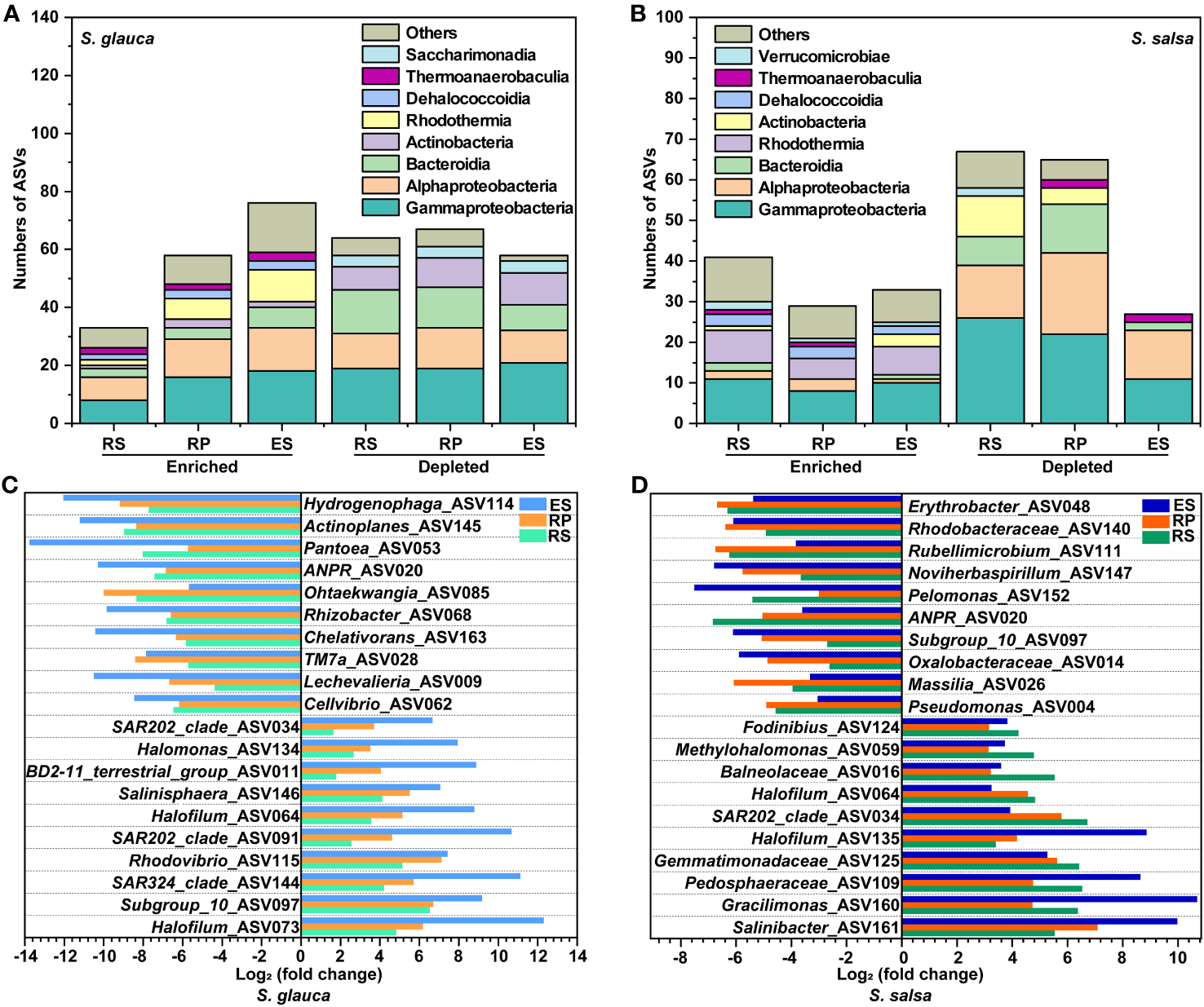 The enriched and depleted ASVs in bulk soils of S. glauca and S. salsa. Stacked bar charts indicate the taxonomy of enriched and depleted ASVs at the class level (A, B). Shared enriched and depleted ASVs between microbes of bulk soils, rhizosphere, rhizoplane and endosphere at the genus level in S. glauca(C) and S. salsa(D).