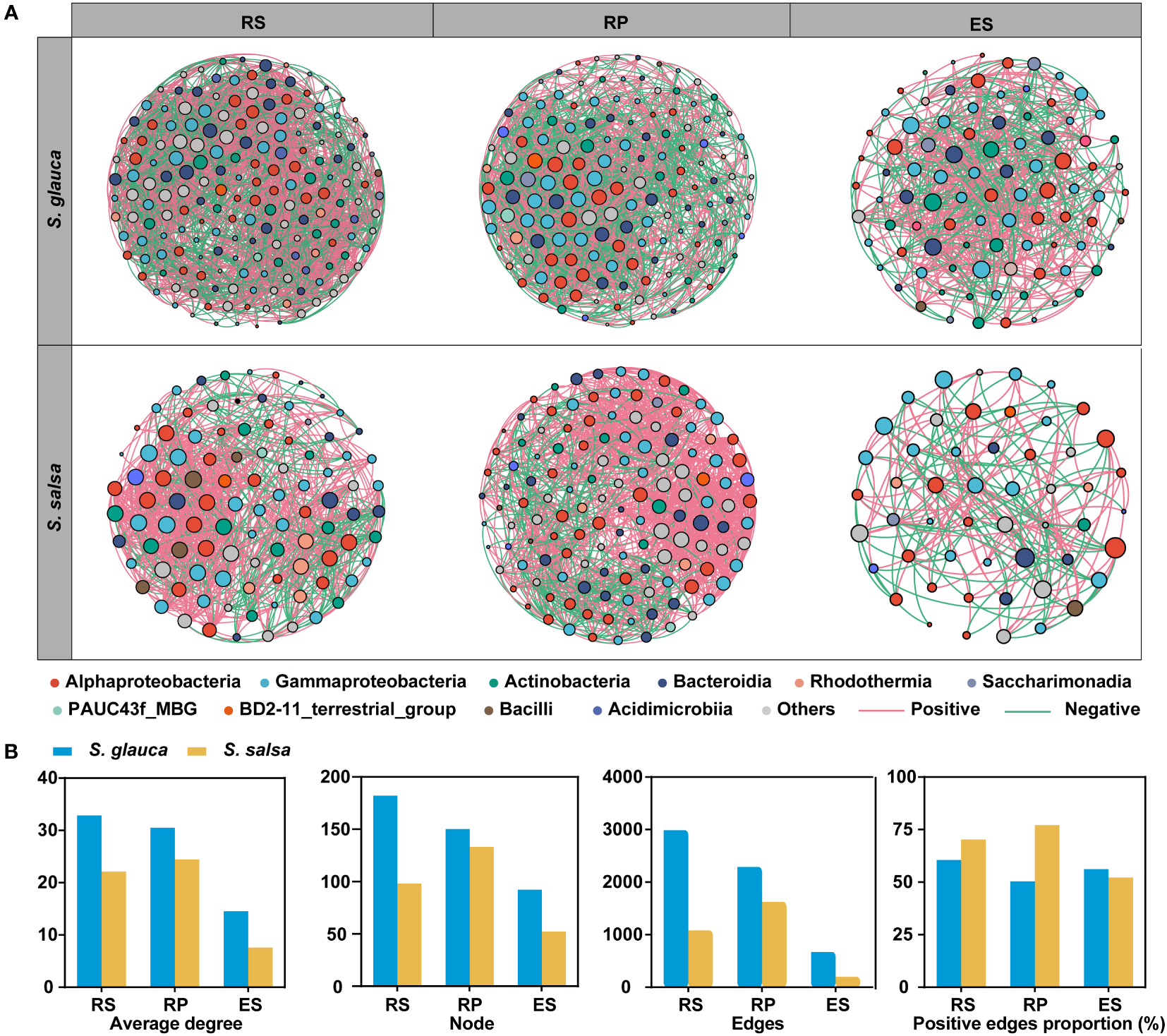 Co-occurrence network analysis was performed to compare the variances in microbial interactions between two plants across three root-related compartments. Consistent with bacterial diversity, network complexity was higher in the rhizosphere and rhizoplane than in the endosphere, with the highest average degree for networks in the rhizosphere of S. glauca (32.846) and the rhizoplane of S. salsa (24.451) and the lowest average degree in endosphere of S. glauca (14.565) and S. salsa (7.615) (Figures 6A, B, Table S3). The number of nodes and edges of the networks showed a clear downward trend from the rhizosphere to the endosphere, indicating a strong influence of niches on bacterial networks (Figure 6B, Table S3). Additionally, network complexity was higher in S. glauca than in S. salsa, with more nodes and edges and a higher average degree in the three compartments of S. glauca (Figure 6B, Table S3). Moreover, co-occurrence networks using dominant bacterial and fungal genera were also constructed, and the results showed that the patterns were similar to those of bacterial networks, with significantly reduced topological parameters in the endosphere, including nodes, edges, and average degree (Figure S4, Table S4). The results indicated that the networks of the rhizosphere and rhizoplane of the two plants were more robust and stable than those of the endosphere.