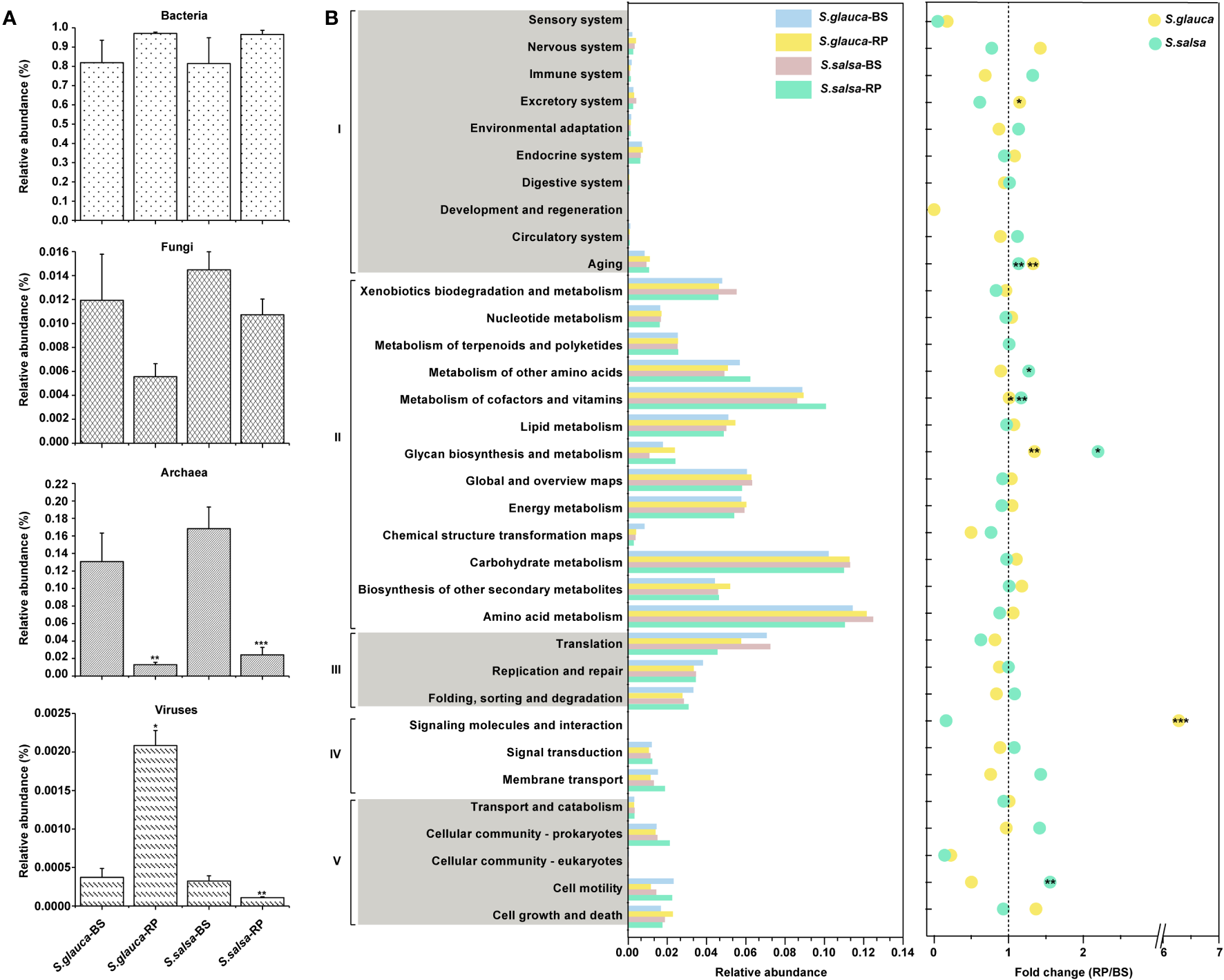 Taxonomic and functional profiles of microbiomes from shotgun sequencing. (A) The relative abundances of bacteria, fungi, archaea, and viruses in bulk and rhizoplane soils. (B) Relative abundances of genes annotated by KEGG databases and fold changes between bulk soils and rhizoplane soils. I, cellular processes; II, environmental information processing; III, genetic information processing; IV, metabolism; V, organismal systems. Stars in circles indicate pathways significantly enriched in rhizoplane soil. P value of < 0.05 (*), < 0.01 (**), or < 0.001 (***).BS, bulk soils; RP, rhizoplane.