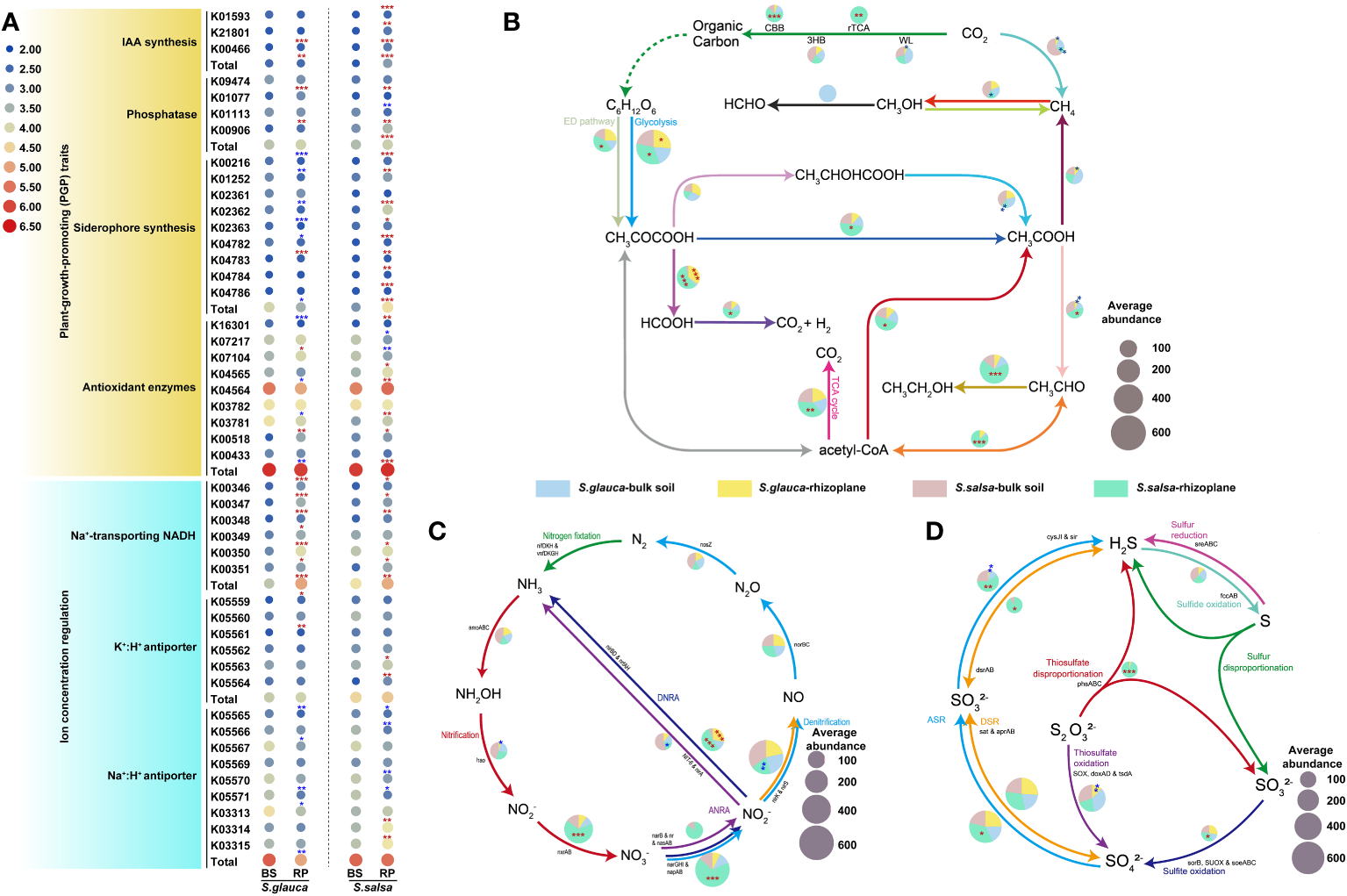 The variances in the relative abundances of genes involved in plant growth promotion and iron concentration regulation (A), carbon (B), nitrogen (C), and sulfur (D) cycle among niches and plants. Red and blue stars indicated relative abundances of gene that were higher or lower in the rhizoplane niche than in bulk soils, respectively (*, P, 0.05; **, P, 0.01). The pie chart size (B, C, D) is proportional to gene abundance related to the pathway. BS, bulk soil; RP, rhizoplane. DNRA, dissimilatory nitrate reduction to ammonia; ANRA, assimilatory nitrate reduction to ammonia.