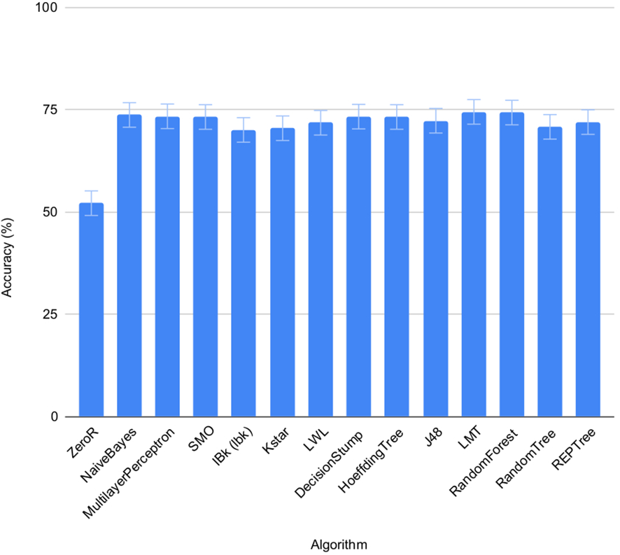 | ZeroR | A rule algorithm that predicts the majority class in case of normal data or the average value. | https://weka.sourceforge.io/doc.dev/weka/classifiers/rules/ZeroR.html |
