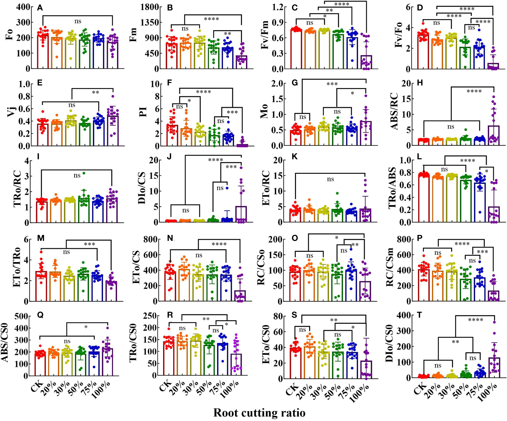 The JIP parameters deduced from ChlF OJIP transient curves in the leaves grown under different RCR (n = 18). F0(A); Fm(B); Fv/Fm(C); Fv/F0(D); Vj(E); PI (F); Mo (G); ABS/RC (H); TR0/RC (I); DI0/CS (J); ET0/RC (K); TR0/ABS (L); ET0/TR0(M); ET0/CS (N); RC/CS0(O); RC/CSm(P); ABS/CS0(Q); TR0/CS0(R); ET0/CS0(S); DI0/CS0(T). The differences between the treatment group and the control group at significance levels of 0.05 (*, P < 0.05), 0.005 (**, P < 0.005), 0.0005 (***, P < 0.0005), and 0.0001 (****, P < 0.0001), using the Dunnett’s multiple comparison test. “ns” represents no significant difference between the control group and the treatment group.