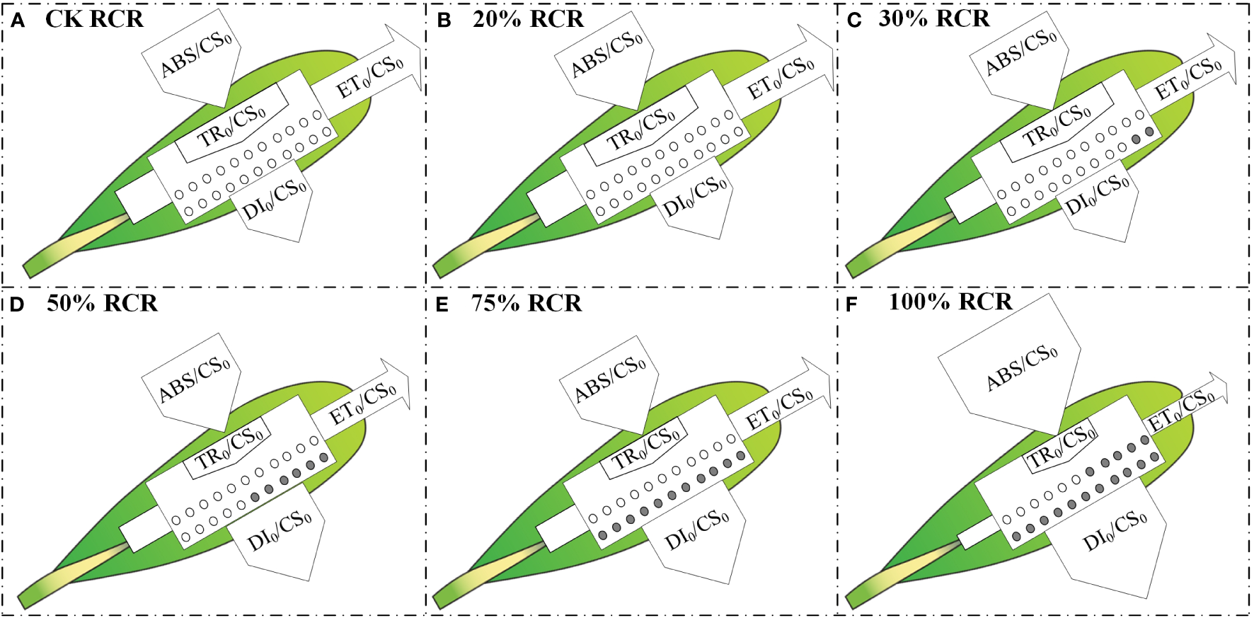 Energy pipeline models of phenomenological energy fluxes per excited cross-section (CS0= O step) in the A. ordosica leaves grown under different RCR. CK RCR (A); 20% RCR (B); 30% RCR (C); 50% RCR (D); 75% RCR (E); 100% RCR (F). ABS, absorption; TR, maximum trapping flux beyond QA; ET, electron transport; and DI, electron dissipation. In the models, active and inactive reaction centers (RCs) are indicated by open and filled circles, respectively.