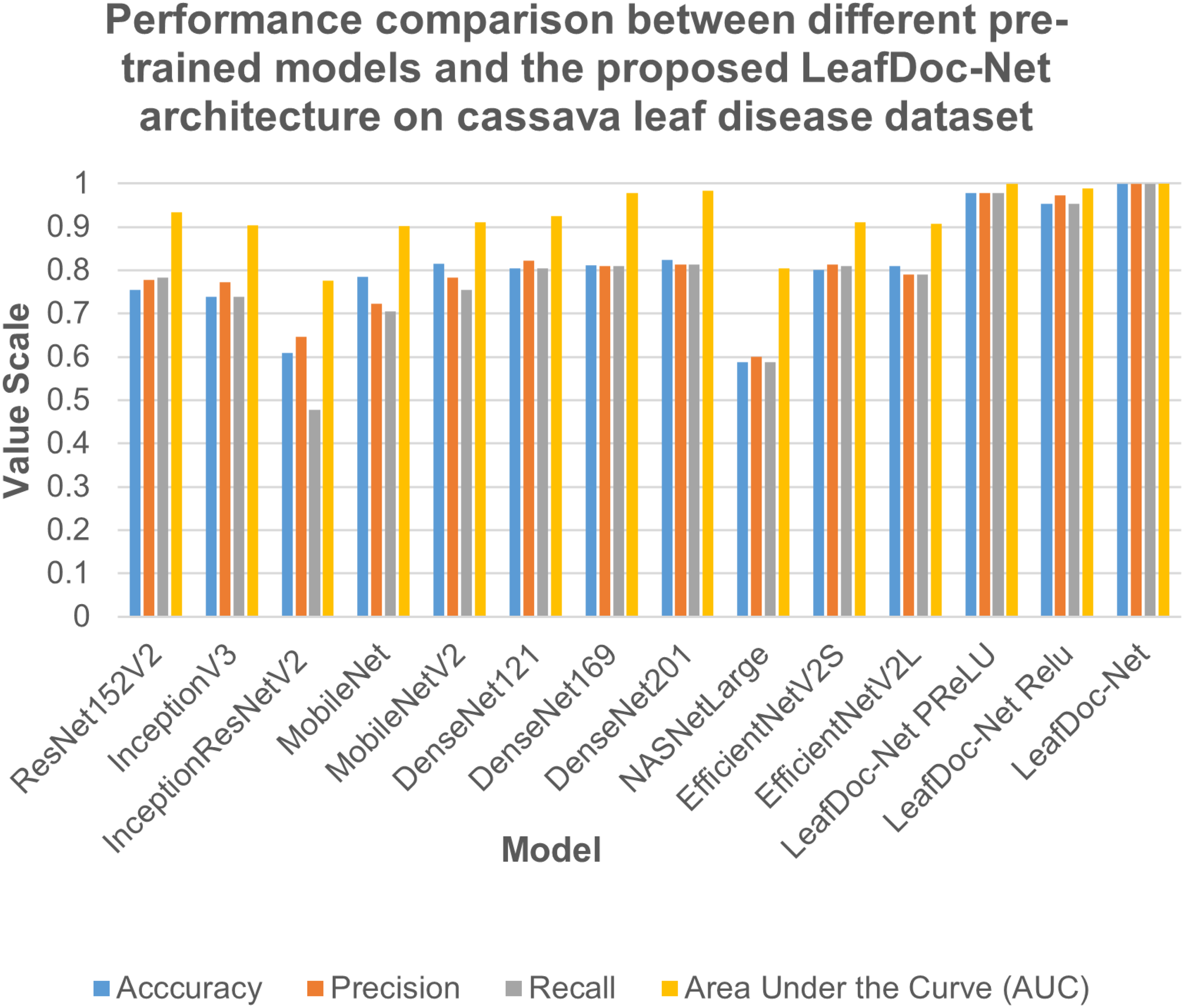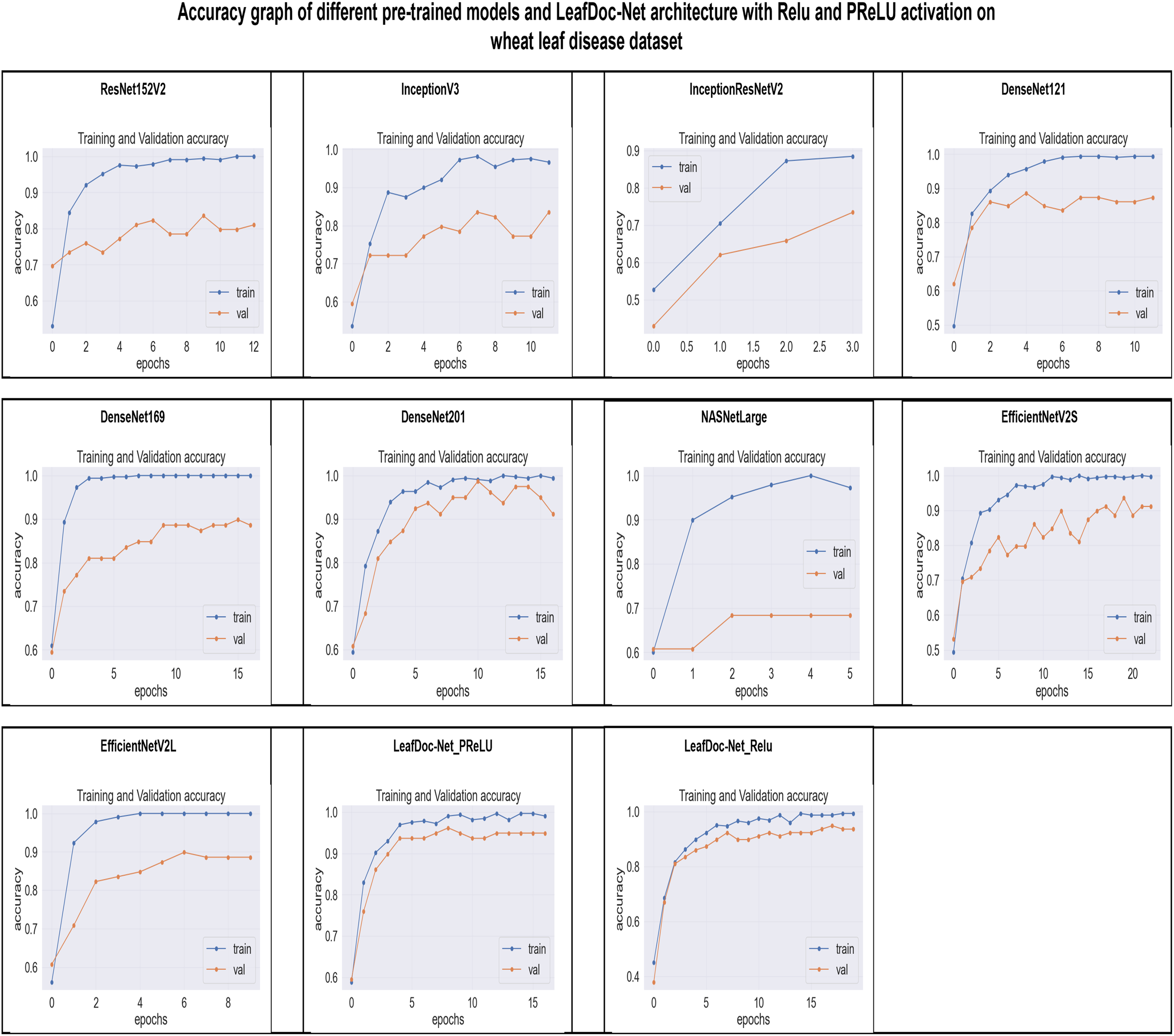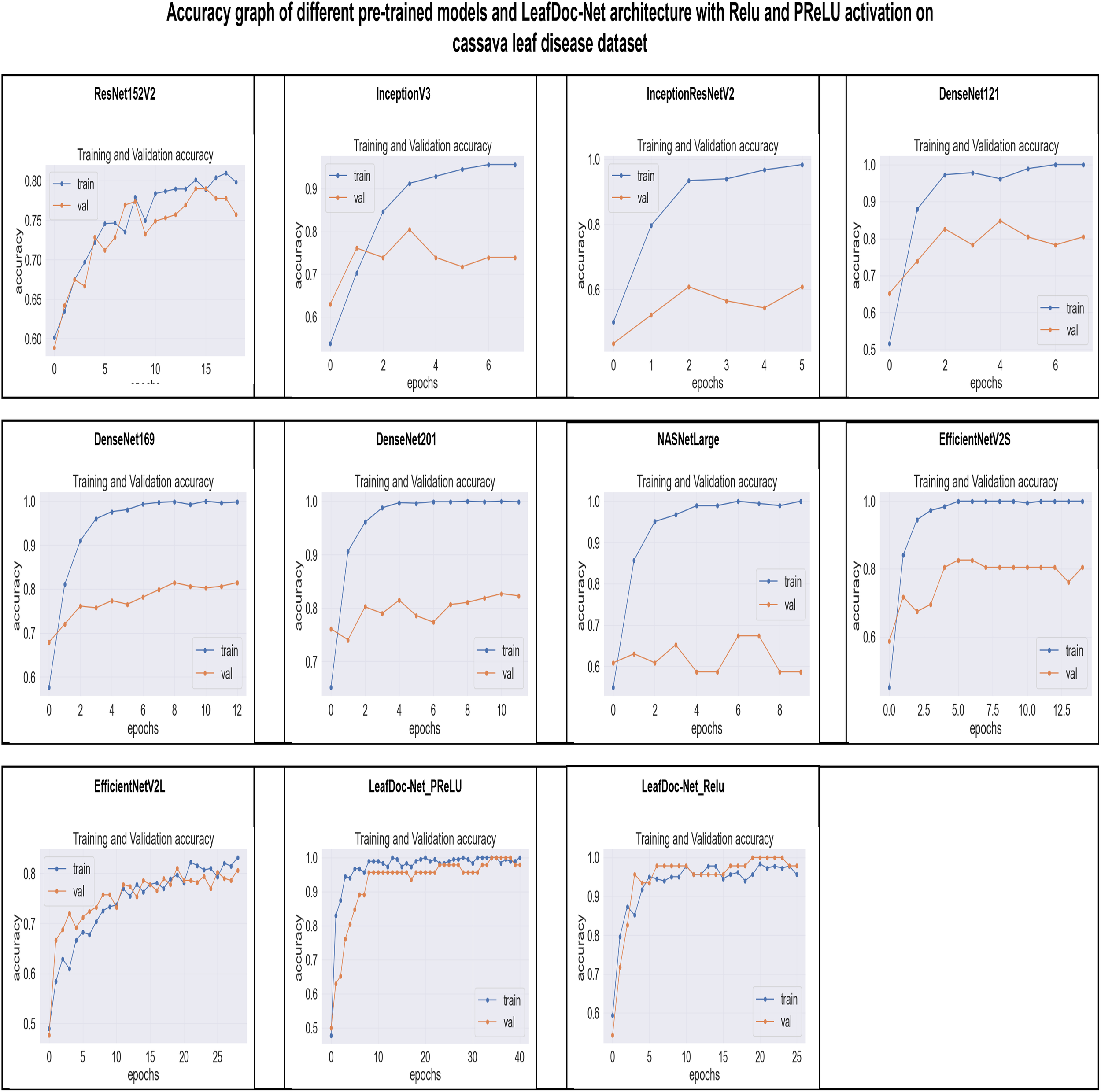 Several pre-trained models such as InceptionV3, ResNet152V2, InceptionResNetV2, MobileNet, MobileNetV2, NASNetLarge, DenseNet121, DenseNet169, DenseNet201, EfficientNetV2S, and EfficientNetV2L were employed to measure the detection performance on the cassava and wheat leaf diseases datasets. All the pre-trained models were trained without freezing any layer. With no learning process restrictions, this method helped the models comprehend the new challenge better. DenseNet201 performed better than other base models on the cassava leaf disease datasets. However, EfficientNetV2s outperformed DenseNet201 on the wheat leaf disease dataset. It proved that no classification model could perform similarly on all leaf disease datasets. Some pre-trained models encountered a significant issue of underfitting, representing significant limitations of the base models. Several Transfer-learning-based strategies, such as integrating various types of layers with the model, have been investigated to address the underfitting and overfitting issues. Transfer learning-based techniques dramatically enhance the detection performance of the proposed LeafDoc-Net architecture.
