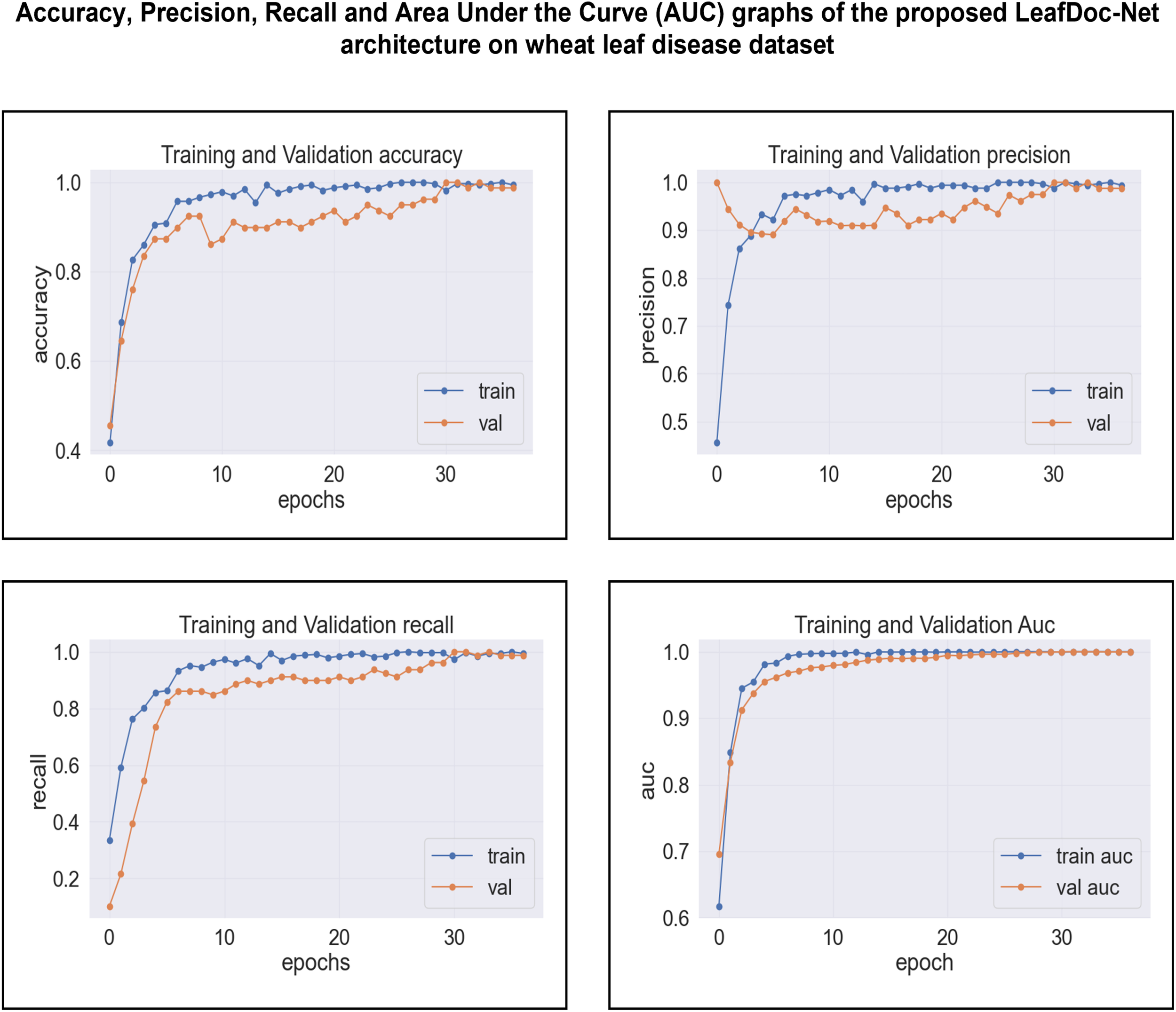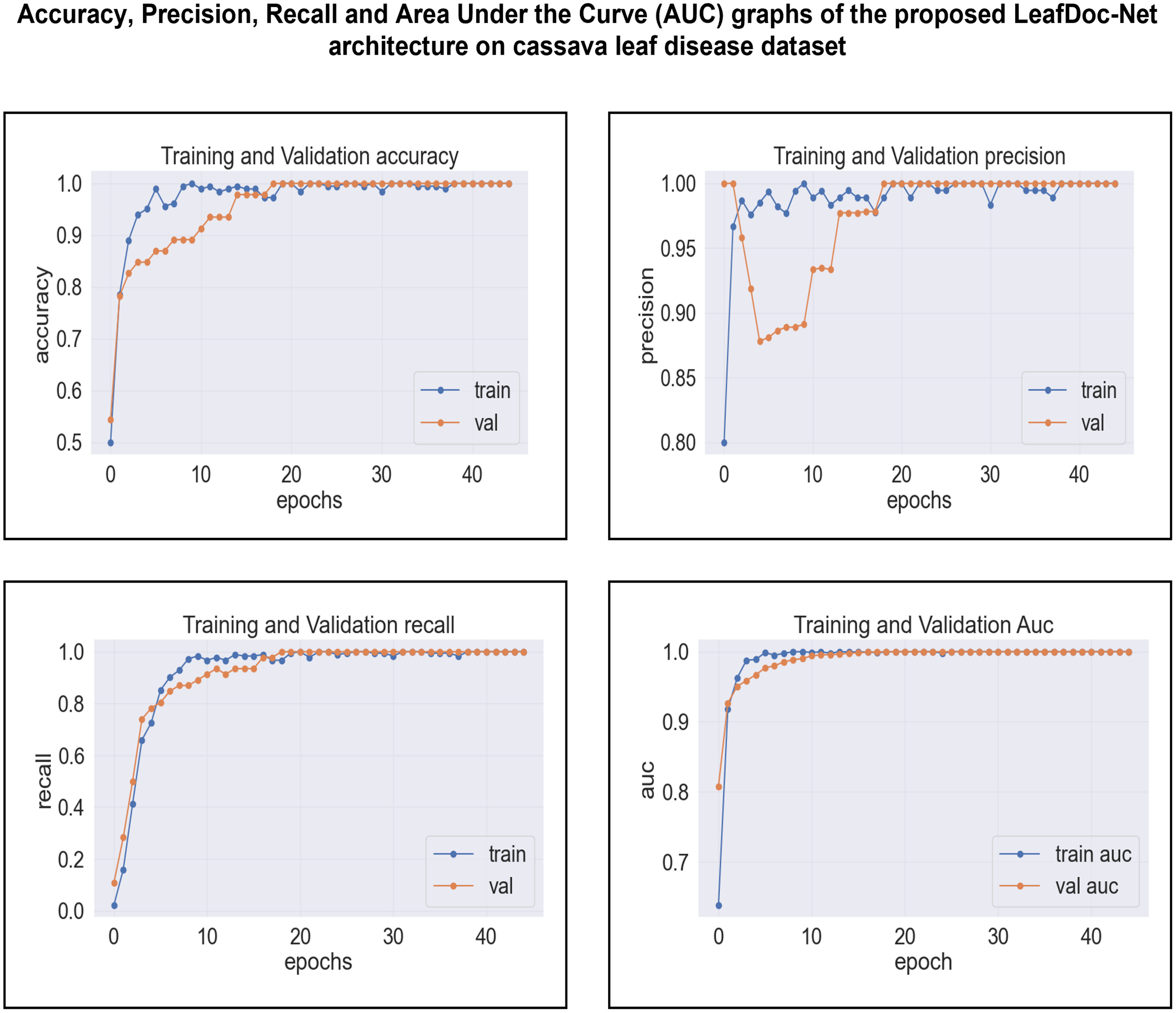 Includes the comparison result between the proposed architecture and the experimented state-of-the-art models in terms of every performance metric, including accuracy, precision, recall, and AUC, for the cassava and wheat Leaf disease dataset