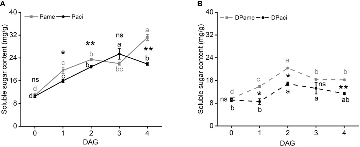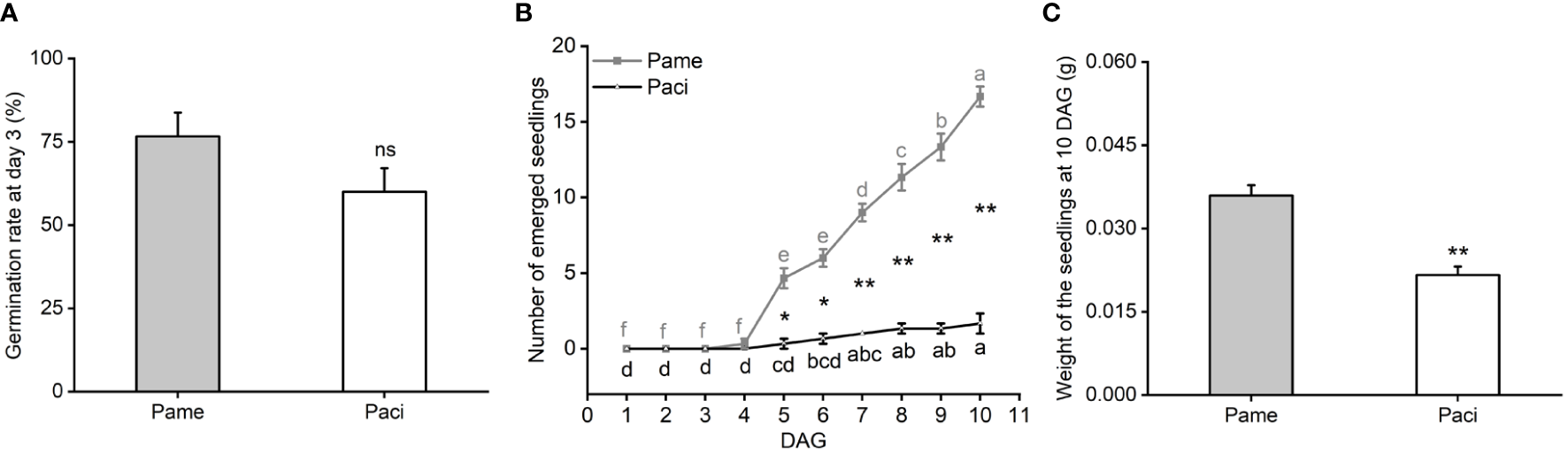 Germination rate at day 3 after seed dormancy breaking treatment (A), number of emerged seedlings with spread cotyledons (B) and weight of the 10 DAG seedlings (C) of Phytolacca americana (Pame) and Phytolacca acinosa (Paci). DAG: day(s) after germination. Values represent the mean ± standard error. Different letters in the same shade as the line indicate that the means differ significantly among the tested time points under one-way ANOVA followed by least significant difference (LSD) test. Asterisks indicate a significant difference between the two species at the same time point under Student’s t-test. *P < 0.05, **P < 0.01, ns P > 0.05.