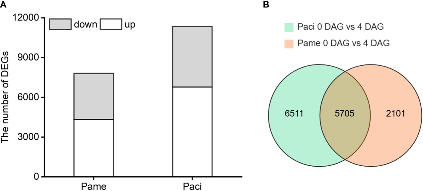 Differentially expressed genes (DEGs) of the 0 vs 4 DAG seedlings of Phytolacca americana (Pame) and Phytolacca acinosa (Paci) (A), and homologous DEGs between 0 vs 4 DAG seedlings of P. americana and P. acinosa(B). DAG: day(s) after germination. Grey represents the number of down-regulated DEGs, and white represents the number of up-regulated DEGs.
