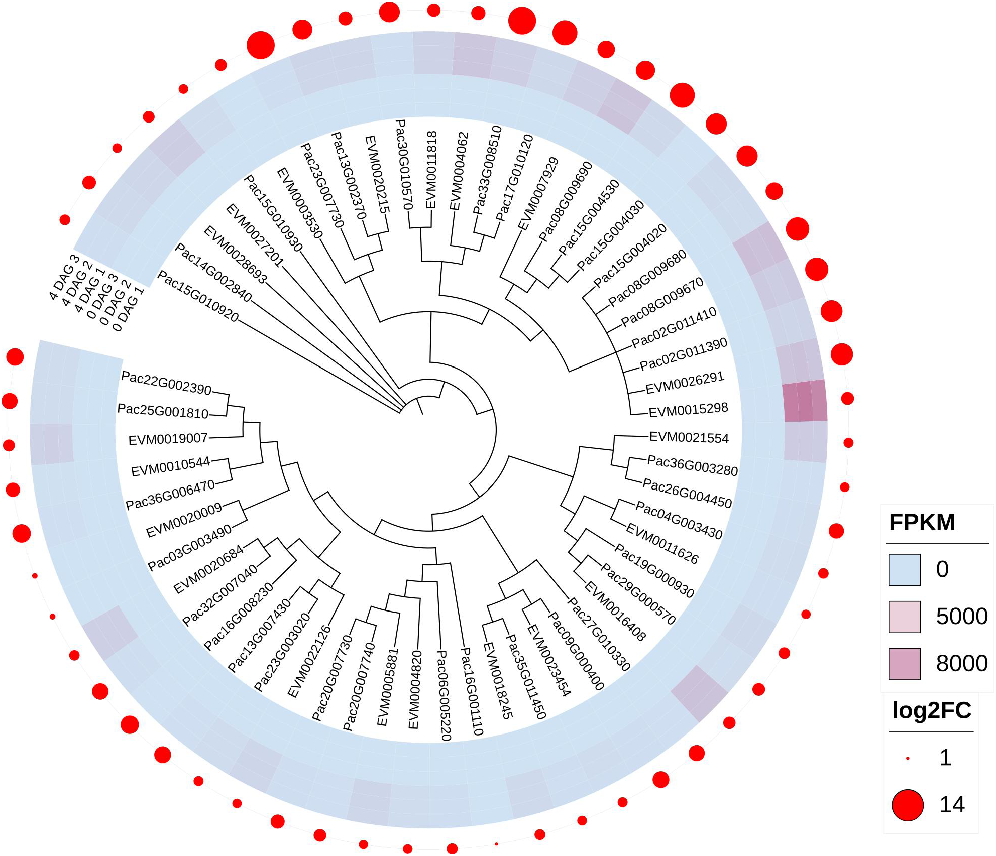 In total, we filtered 23 photosynthesis-antenna proteins pathway DEGs in the 0 vs 4 DAG seedlings for P. americana and 37 DEGs in P. acinosa seedlings. The phylogenetic tree suggested that photosynthesis-antenna proteins pathway DEGs between P. americana and P. acinosa were highly similar. Even though these DEGs were significantly up-regulated, many DEGs in P. acinosa seedlings were more highly expressed compared to their homogeneous genes in P. americana (Figure 3).