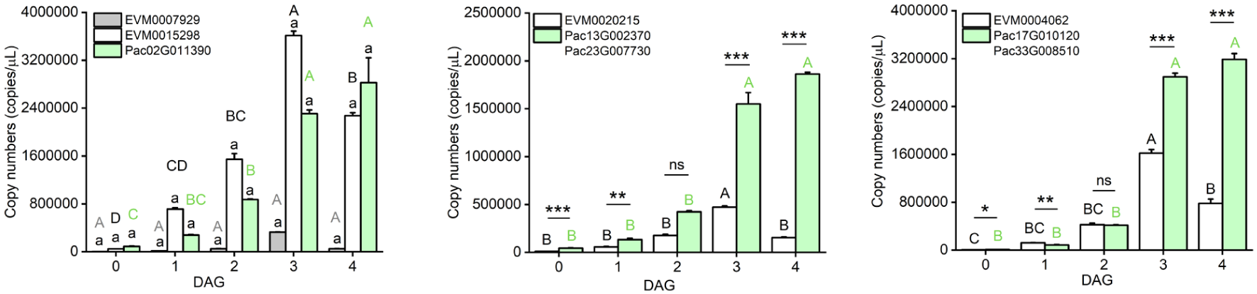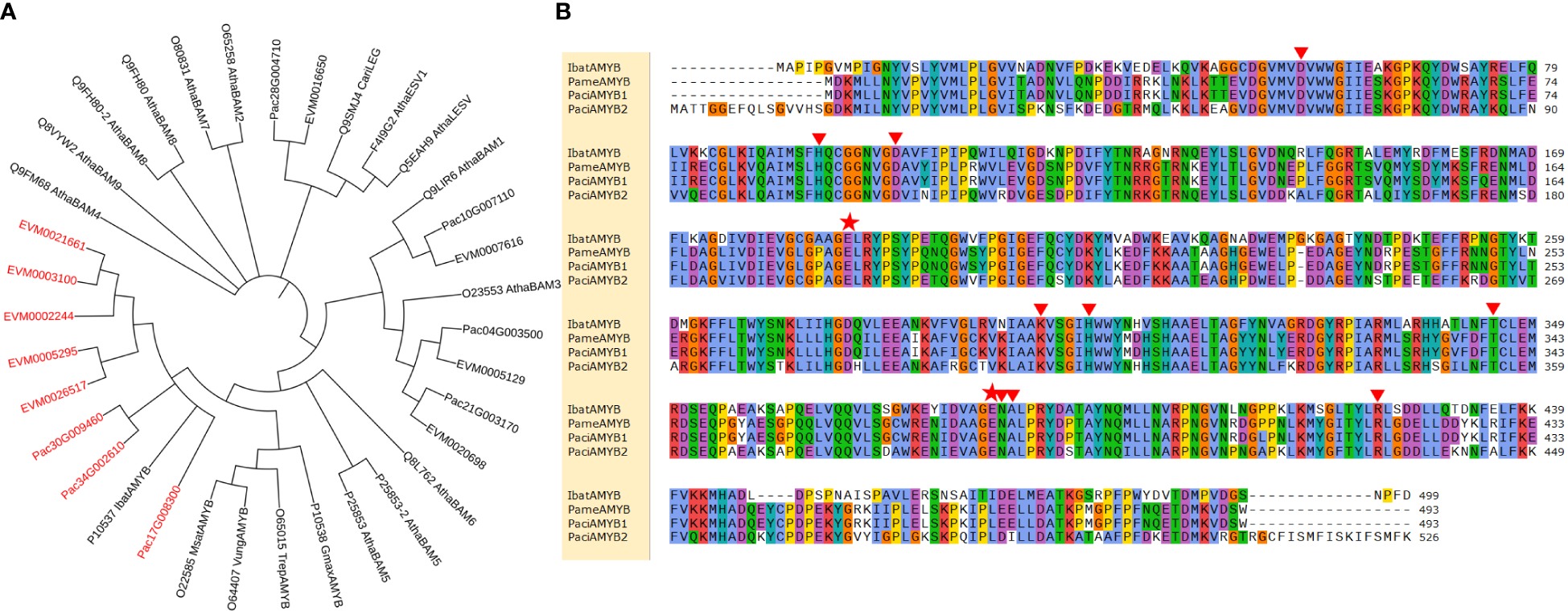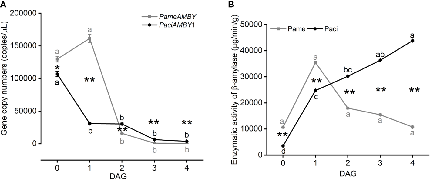 We also found that β-amylase genes in starch and sucrose metabolism were significantly down-regulated compared with other DEGs in the selected KEGG pathways in P. americana. An additional phylogenetic tree was constructed based on the deduced amino acid sequences for the β-amylase DEGs in P. americana and P. acinosa together with β-amylases with reviewed functions in UniProt (Hall and Notes, 2013). According to the reference genomes of P. americana and P. acinosa, candidate β-amylase genes were amplified with the primers listed in Table 2, and then sequenced. Substrate-binding and protein active sites of the deduced amino acid sequences from the amplified sequences were verified according to the homologous β-amylase in Ipomoea batatas (Yoshida and Nakamura, 1991) using SnapGene (4.2.4, GSL, Biotech, USA). qPCR was also conducted to analyze the β-amylase gene expression of the seedlings at 0, 1, 2, 3, and 4 DAG.