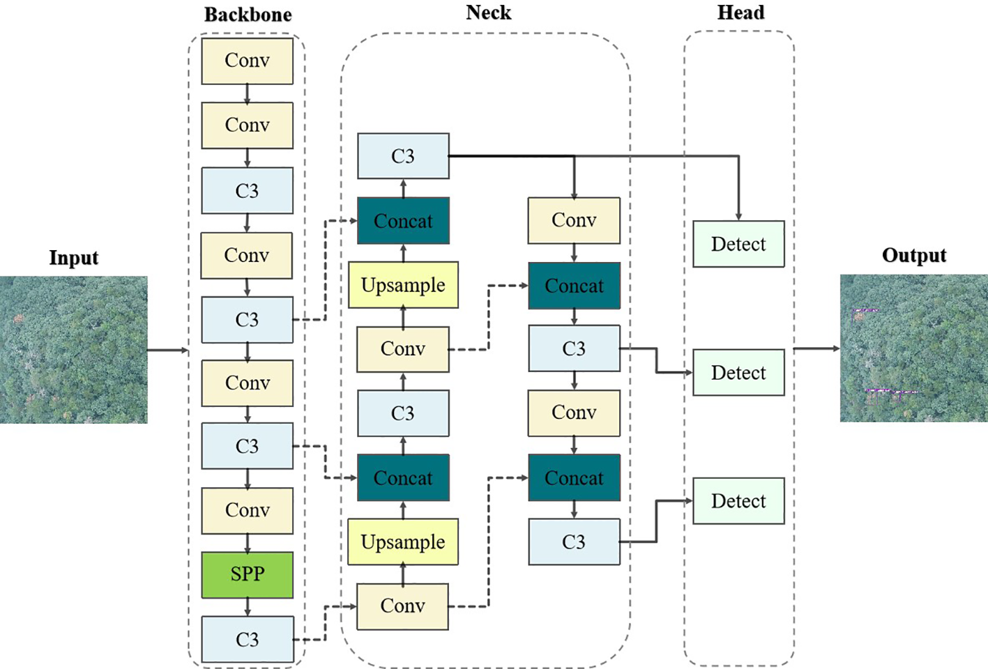 In this paper, YOLOv5-Lite (as shown in Figure 4) was utilized as the fundamental algorithm for detecting PWD-infected trees. Compared with YOLOv5, the YOLOv5-Lite introduces innovative techniques to enhance the detection speed and reduce model parameters count, thus fulfilling the dual objectives of higher detection accuracy and stronger real-time performance.