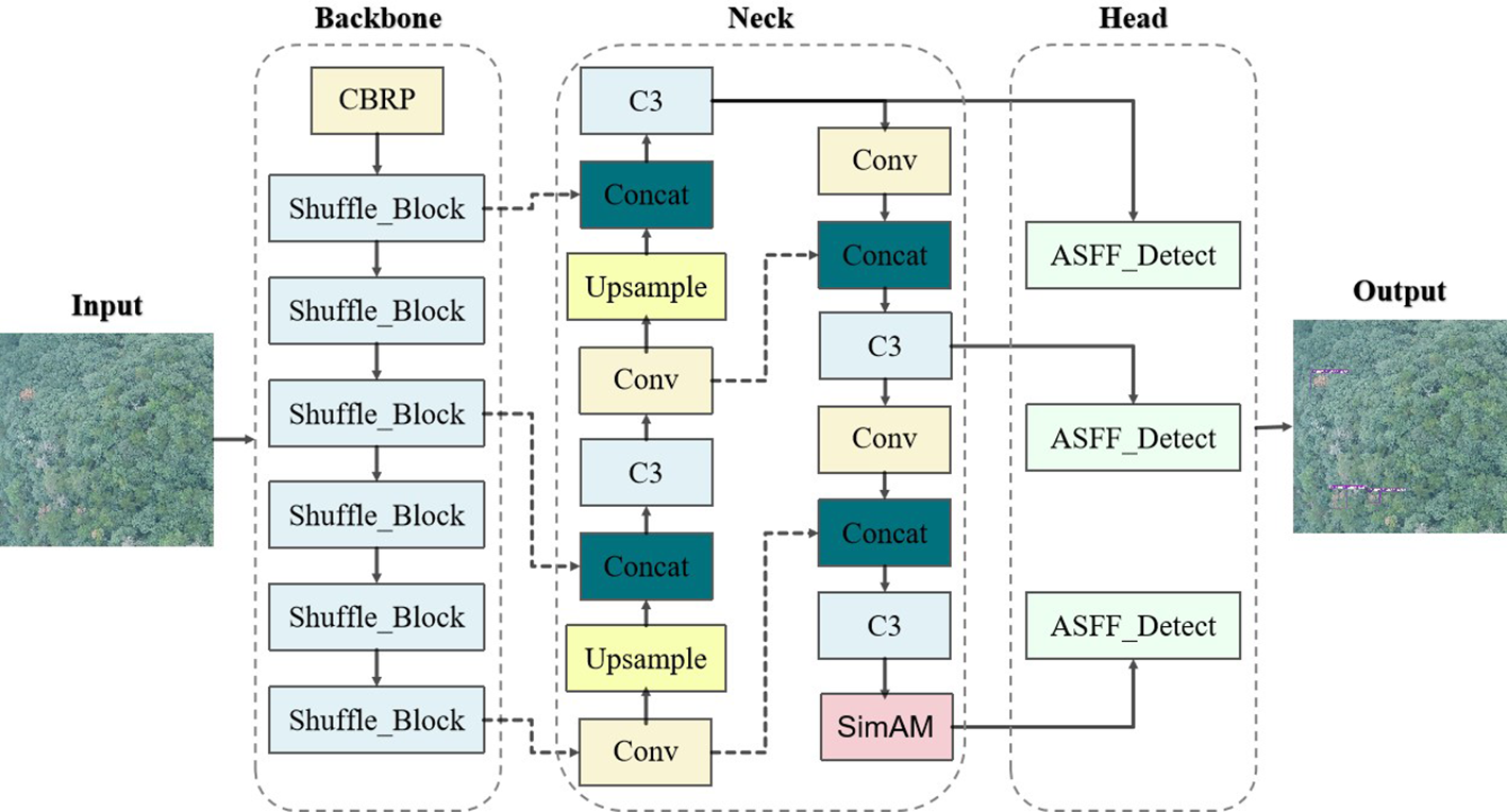 PWD-infected pine trees are often obscured in various complex backgrounds, covering by other trees or only appearing subtle targets. In standard YOLOv5-Lite implementations, small target features tend to diminish as the network depth increases during detection. Consequently, the detailed features of these small targets gradually disappearing in the subsequent network propagation, causing missed or false detection. Moreover, this study aims to apply the detection model to mobile devices for rapid, real-time identification. To address these challenges, we enhanced the YOLOv5-Lite by refining its model size and parameter number for increased lightness. In addition, we improved the feature extraction and fusion capability of the neck network to increase accurate. Specifically, our proposed algorithm (as shown in Figure 5) replaced the original CSPLocknet53 backbone with the light-weight ShuffleNetV2. It also integrated the SimAM attention mechanism into the neck network path aggregation network (PANet), and appended an adaptively spatial feature fusion (ASFF) module after PANet for improving performance.