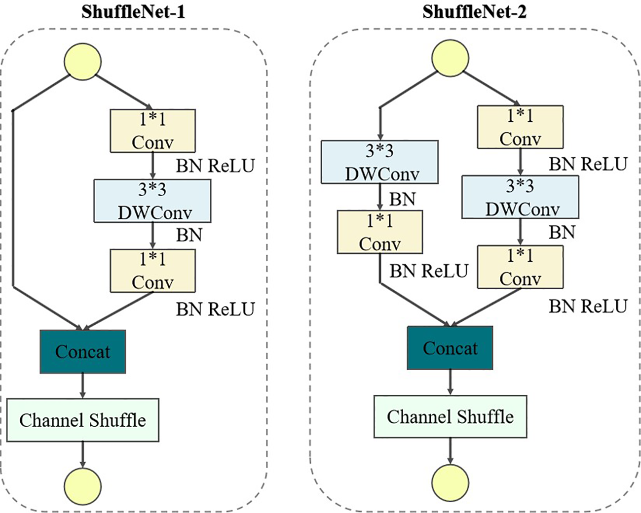 In the ShuffleNet-1 unit of the ShuffleNetV2 (as shown in Figure 6), the input feature map is first divided into two branches, each with half the channels. The left branch preserves the feature map intact through identity mapping, while the right branch goes through three convolutions including two 1×1 ordinary convolutions and a 3×3 depthwise convolution (DWConv), both using the same input and output channel numbers. Following the convolutions, the branches are reunited through concatenation (Concat), and Channel Shuffle is employed to facilitate cross-group information exchange, ensuring thorough channel integration. Contrastingly, in the ShuffleNet-2 unit, the feature map is directly distributed across two branches, both utilizing 3×3 DWConv with a step of 2. This configuration effectively reduce the height (H) and width (W) of the feature map, thereby reducing the amount of computational overhead. The outputs from branches are then concatenated by the Concat operation, doubling the channel count while without changing the network parameter amount significantly. Finally, channel shuffling is utilized to exchange information across channels.