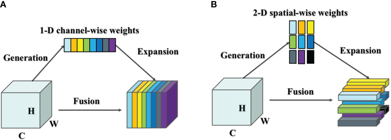YOLOv5-Lite treats the target detection process as a regression task. However, it does not distinguish well between the foreground and background regions in the input image, potentially leading to missed or incorrect detections. This challenge arises due to the limited number of occupied pixels by the foreground target and the presence of a complex background, which can obscure crucial information about the target. To address this issue, this study enhances the feature representation of the target by introducing an attention mechanism. The attention mechanism can be broadly categorized into two types: spatial attention mechanism and channel attention mechanism (as shown in Figure 7) (Mo et al., 2023).