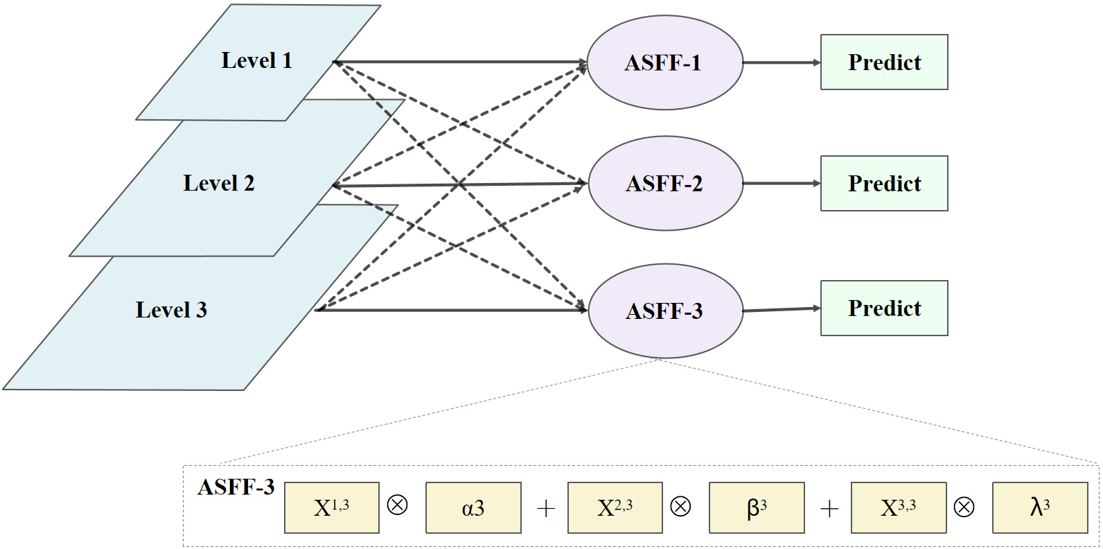 ASFF is a network based on adaptive spatial feature fusion. It takes the Level1, Level2, and Level3 layer feature maps output from the PANet network as input. After the feature fusion operations of ASFF-1, ASFF-2, and ASFF-3 are performed respectively, the fused feature maps of each layer are finally predicted as output. During fusion, all layers are adjusted to have the same channel size and number, and corresponding weight coefficients are calculated. Finally, the feature map is multiplied by the weight coefficient of each layer and the sum of the multiplication results is calculated to achieve feature fusion.