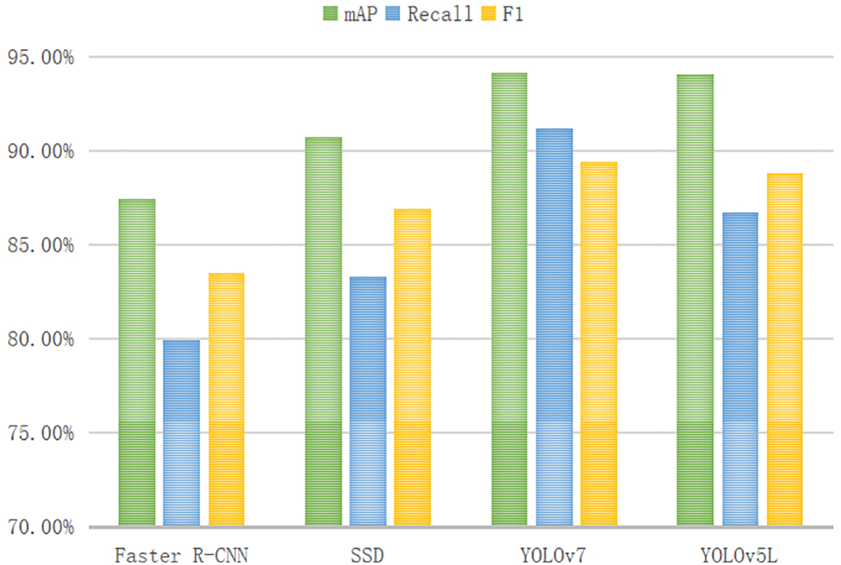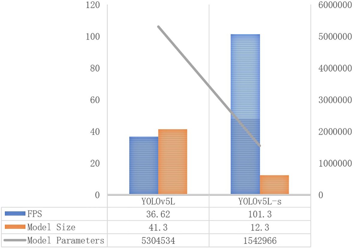 We chose a 10-fold cross-validation method to evaluate the accuracy of the model. There are six evaluation indexes, i.e., three accuracy evaluation indexes of mean Average Precision (mAP), Recall, and F1, and three indexes to evaluate the lightweighting effect, that is, Frames Per Second (FPS), model size, and number of model parameters. mAP is one of the most important metrics in target detection to evaluate the detection accuracy performance of the model, its value is usually calculated by an Intersection over Union (IoU) with a threshold of 0.5. Recall represents the proportion of positive samples correctly predicted to all true positive samples, and F1 is the total average of model accuracy and recall, which is used to evaluate the effectiveness of the model. In the three indexes to evaluate the lightweighting effect, the larger the frames per second (FPS) transmission, the more images can be detected per second and the smoother the display. The smaller the model size, the better the lightweighting of the model. Similarly, the smaller the number of parameters, the better the lightweighting of the model. Specifically, the indicators are determined by Equations 12–16.