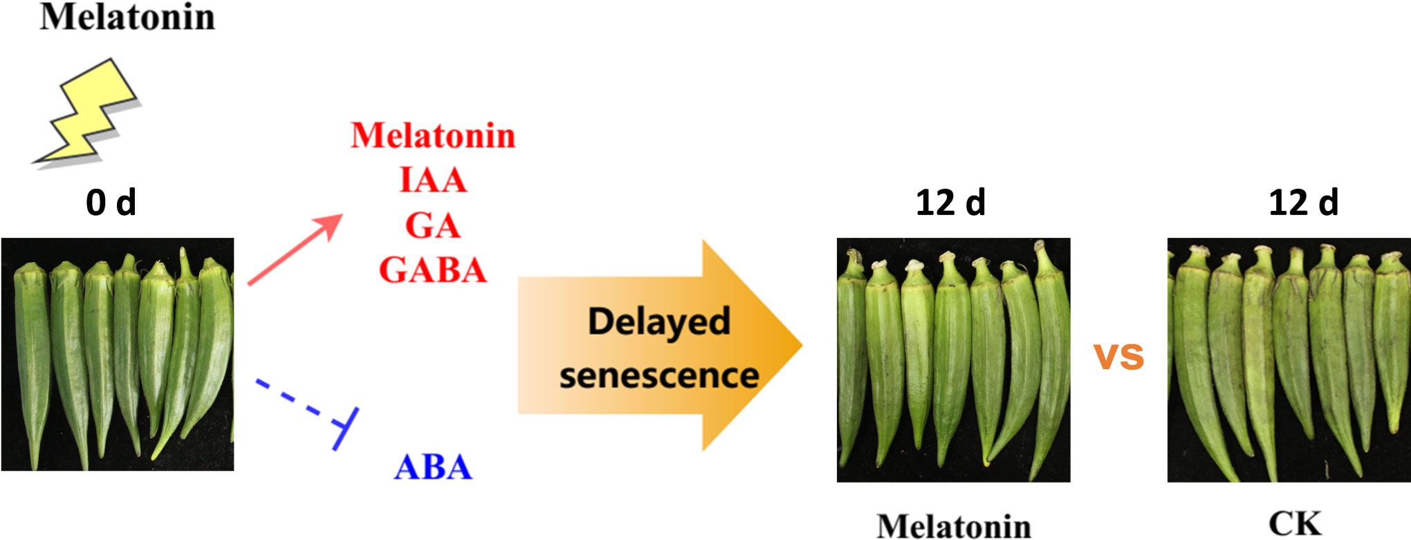 Figure 7 Experimental framework. Melatonin treatment positively regulated endogenous plant signalling molecules including melatonin, IAA, GA, and GABA, and inhibited the accumulation of ABA, thereby delaying senescence in okras after harvest.
