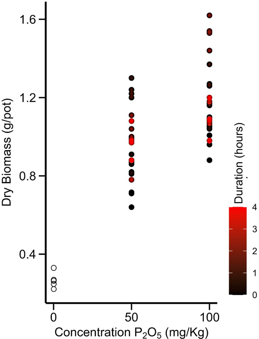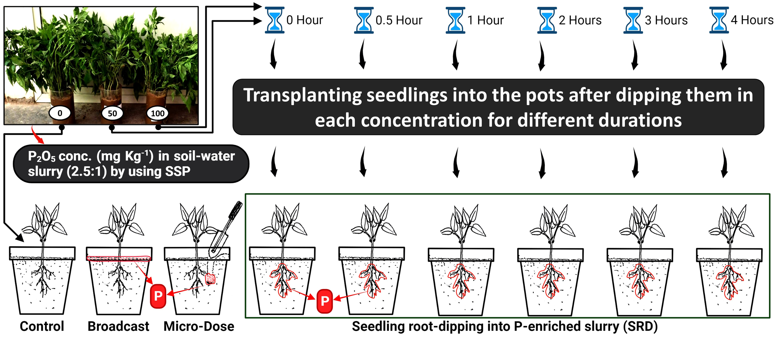 In the early stages of growth, crops acquire more P which promotes better root development. When plants reach 25% of their total dry weight, they may have already accumulated about 75% of their total P requirements (Ross and Middleton, 2013). Moreover, research has indicated that the concentration of P in root cells can be up to 1000 times greater than the concentration in the soil solution (Ramaekers et al., 2010). Therefore, it is key to develop a P application method particularly in transplanted crops that facilitates better root architecture during initial crop growth to allow for exploration of more soil volume and enhanced uptake of other essential nutrients. One possible method is to dip seedling roots in P-enriched soil slurry (SRD) just before transplanting, which allows the seedlings to absorb a certain amount of P. Furthermore, P-enriched soil adhered to the roots after dipping acts as a localized P source, enhancing the PUE (Kalidas-Singh and Thakuria, 2018; Goswami and Kalidas-Singh, 2023) (Table 1). It is also important to note that excessive exposure to P after certain limit, it can cause toxicity to the plant and reduce P uptake (Oo and Tsujimoto, 2023). Thus, it is crucial to determine the optimal concentration of P and dipping duration. Several studies have reported that the SRD method can increase grain yield of transplanted rice by 10% to 50% with reduced P application rates compared to broadcasting in highly P-fixed acidic soil conditions (Lu and Jiang, 1982; Hooper, 1991; Balasubramanian et al., 1995; Talukdar et al., 2001; Kalidas-Singh and Thakuria, 2018; Oo et al., 2020a; Rakotoarisoa et al., 2020). However, there is no research on this method for other transplanted horticultural crops like Chilli (Capsicum annuum) in alkaline soil. Such crops require adequate fertilization, especially with P fertilizers, in order to achieve higher productivity (Sharif and Claassen, 2011; Emongor and Mabe, 2012). Additionally, no study has reported a comparison between the SRD and MDP methods. So, this study aimed in determining the optimal P concentration and incubation duration for SRD method of P application in chilli (Capsicum annuum) in terms of biomass production in comparison to the recommended full dose of P by broadcasting method (FD) and micro-dose placement method (MDP).