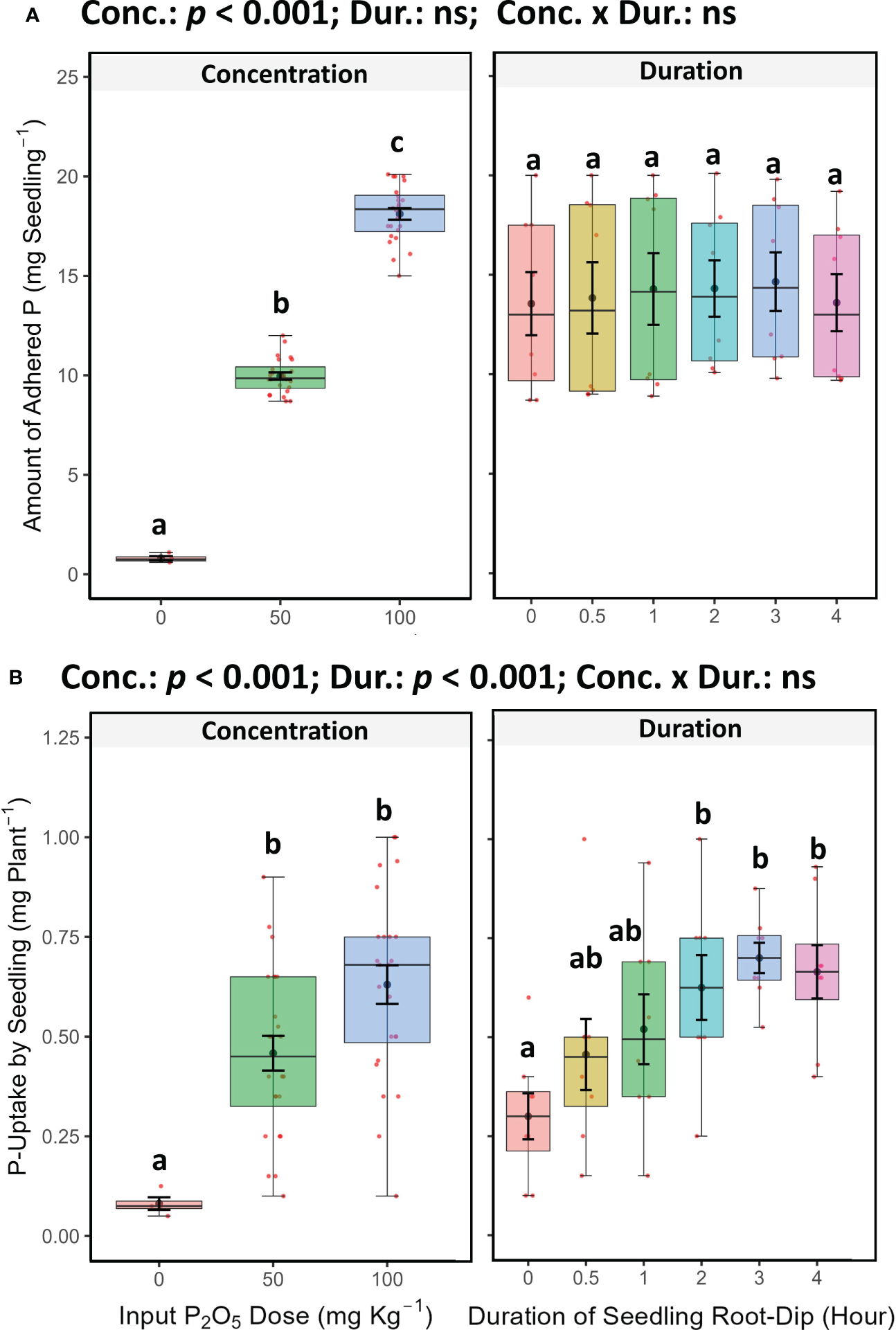 (A) Phosphorus (P2O5) adhesion on roots of Chilli (Capsicum annuum) seedlings after dipping in SSP-amended slurries with different P concentrations and duration in SRD method, (B) Phosphorus uptake by seedling (variety: Arka Khyati; 40 days old) after root dipping in SSP-amended different P concentration slurry and duration. In both cases, mean ± SE of 24 concentration factor measurements and 8 dipping duration factor measurements are shown as thick points with error bars in each box plot. Different letters denote significance at p < 0.05 via Tukey’s HSD, indicating the interaction of concentration and dipping duration in SRD determined by Two-Way ANOVA. “ns” indicates non-significance at 0.05%.