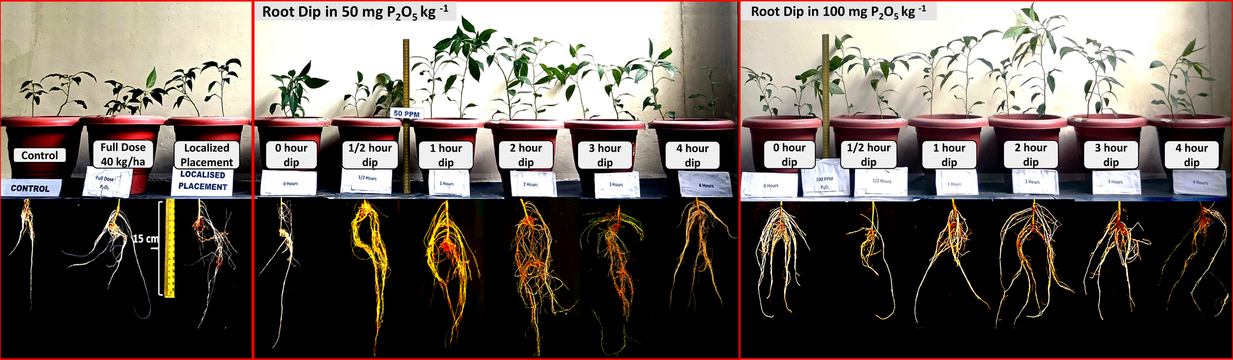 A pot experiment was set up at the experimental site of College Farm, ITM University, Gwalior, Madhya Pradesh, India, to compare the effectiveness of fertilizer application methods viz. Full dose broadcasting method (FD), micro-dose placement method (MDP) and seedling root-dipping into P-enriched slurry methods (SRD). The experiment also aimed to determine the optimum concentration of P and duration of dipping chilli seedlings in P-enriched soil slurry for the SRD method. The objective of the experiment was to identify the best method for achieving optimal results.