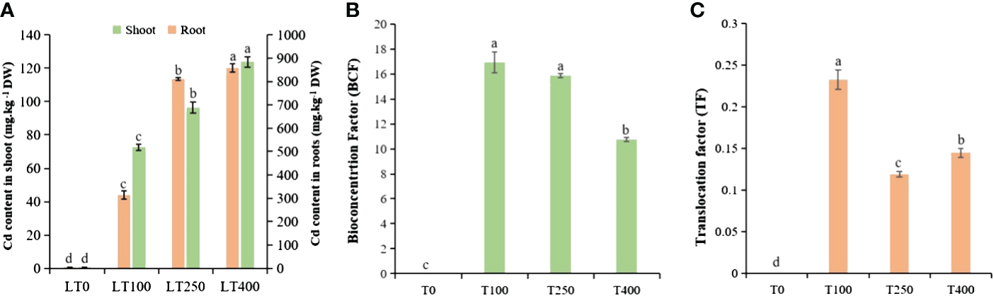 Cadmium accumulation and transport in kenaf under different concentrations of Cd stress. (A) Cd content in kenaf root and shoot tissues after exposure to various Cd concentrations. (B) BCF and (C) TF of Cd in kenaf. The X-axis depicts different Cd concentrations as LT0, LT100, LT250, and LT400. The bars represent the mean standard error (n = 3). Significant differences between treatments at p ≤ 0.05 are indicated by different lowercase letters. BCF, bioconcentration factor; TF, translocation factor.