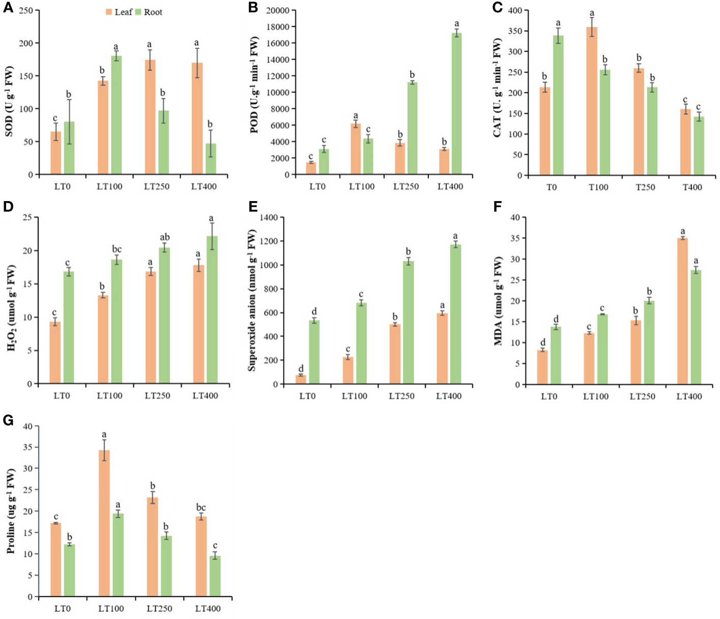 Physiological parameters in kenaf leaves and roots after 10 days of different Cd treatments. (A–C) SOD, POD, and CAT antioxidative enzyme activities, respectively. (D–F) Oxidative stress indicators H2O2 content, superoxide anion, and MDA content, respectively. (G) Protein content. The X-axis depicts different Cd concentrations as LT0, LT100, LT250, and LT400. The bars represent the mean standard error (n = 3). Significant differences between treatments at p ≤ 0.05 are indicated by different lowercase letters. SOD, superoxide dismutase; POD, peroxidase; CAT, catalase; MDA, malondialdehyde.