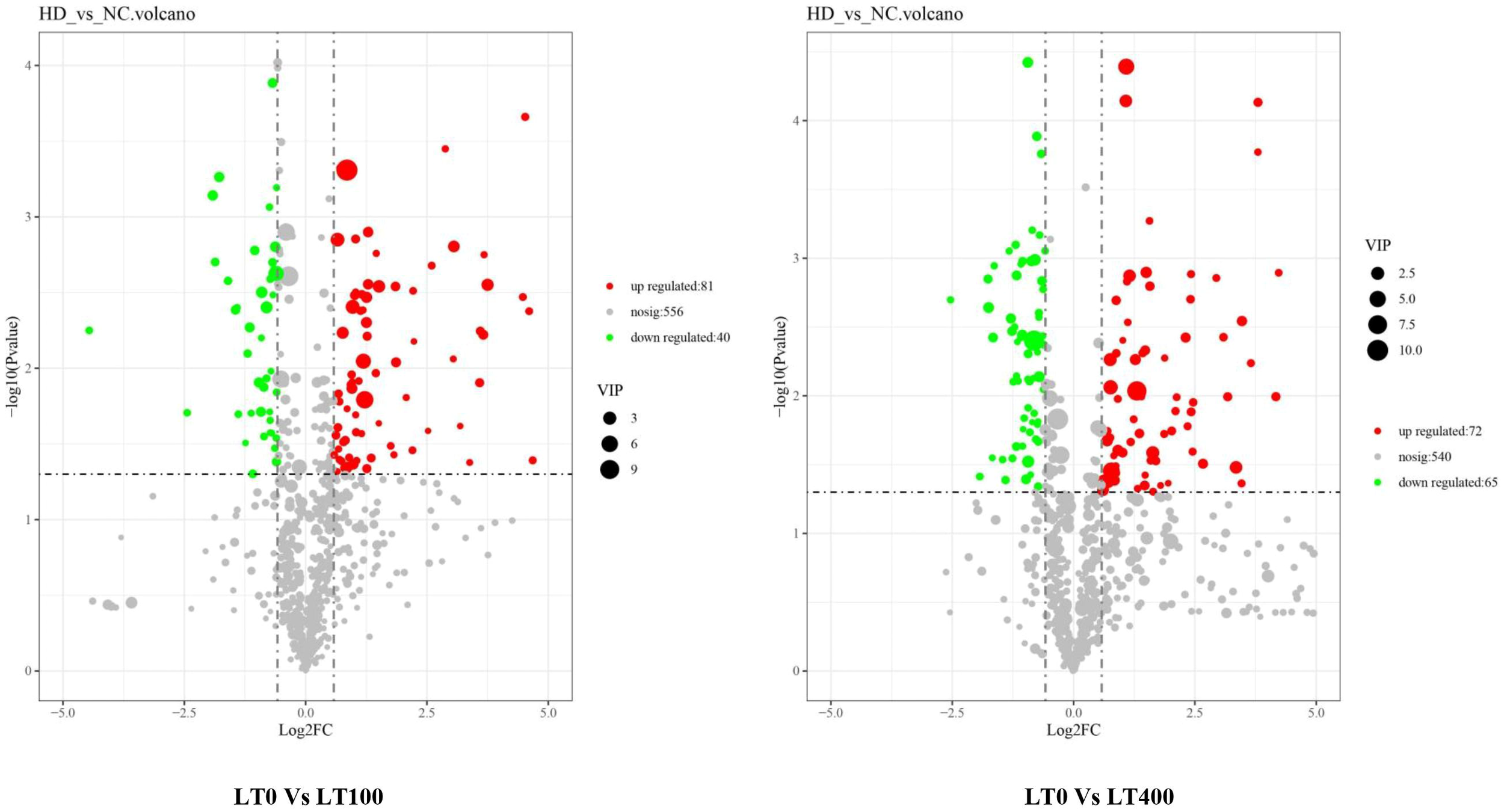 Volcano plot of Cd-induced differential metabolite in LT0 vs. LT100 and LT0 vs. LT400 comparison groups of kenaf leaves.