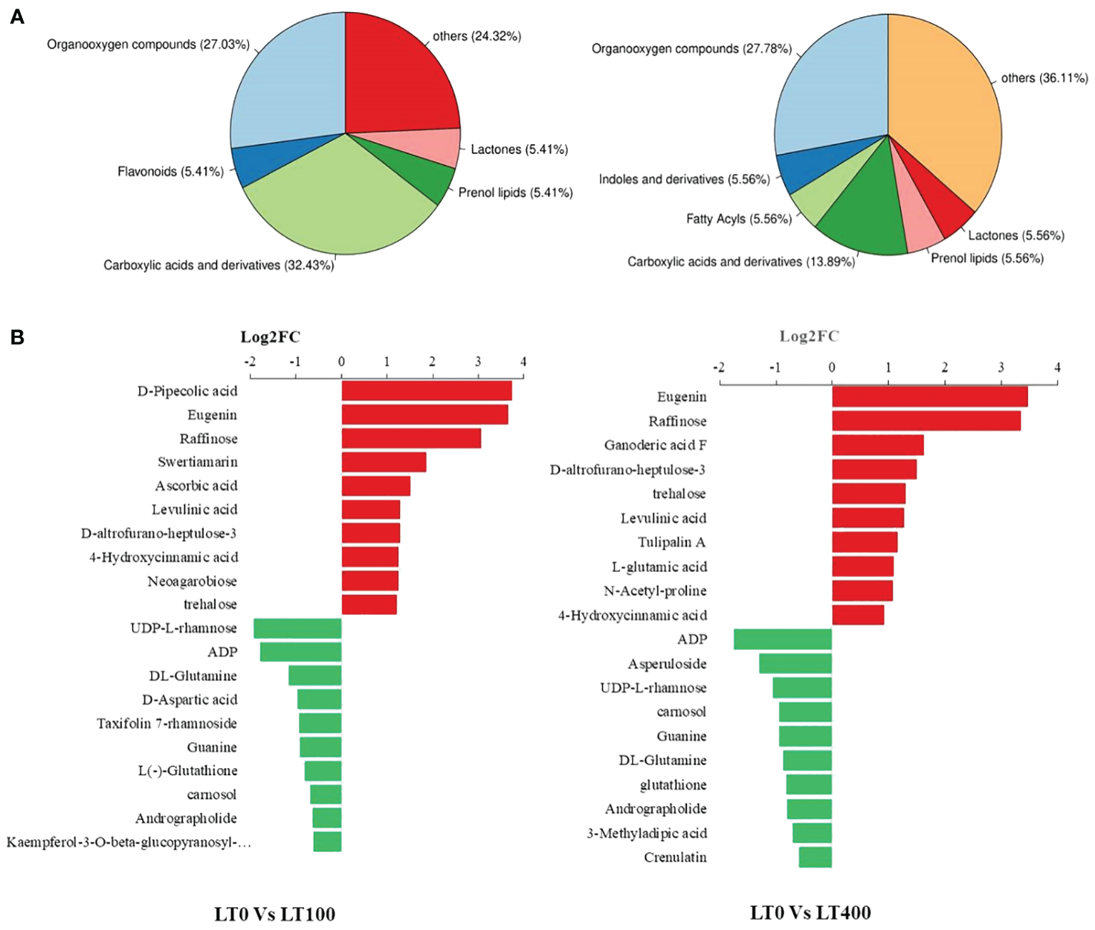 Classification of differentially accumulated metabolites in kenaf leaves. (A) Classification of differential metabolites in LT0 vs. LT100 and LT0 vs. LT400 comparison group. (B) Up- and downregulation of the top 10 differential metabolites in LT0 vs. LT100 and LT0 vs. LT400 comparison group.