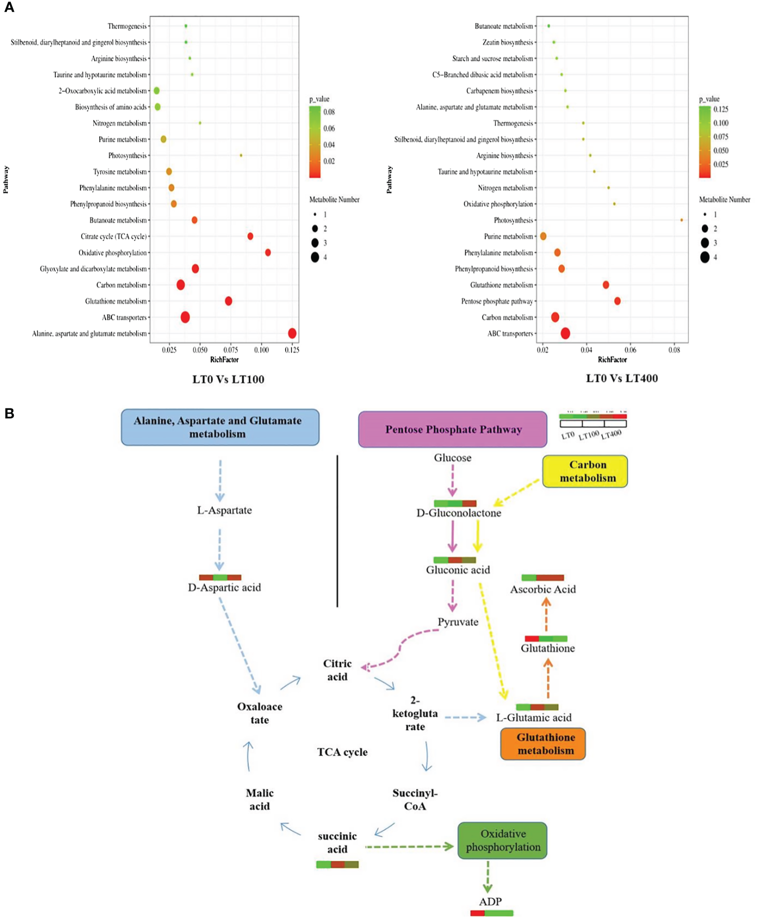 The pathways of the differential metabolites were annotated using the KEGG database, and the metabolites were categorized based on the associated pathways or their respective functions. The distribution of KEGG pathways was shown at the second hierarchical stage (Supplementary Figure 4). The largest pathway group was the global and overview map followed by carbohydrate metabolism in both comparison groups. The enrichment analysis results revealed that the differential metabolites in the comparison group of LT0 vs. LT100 exhibited significant enrichment in alanine, aspartate, and glutamate metabolism, oxidation phosphorylation, and citrate (TCA) cycle, while ABC transporter, carbon metabolism, pentose phosphate pathway, and glutathione metabolism were the most enriched pathways in the LT0 vs. LT400 comparison group (Figure 7A). A schematic representation of the metabolic network of the differential metabolites, which were shown to be distinct among the comparison groups, is presented by integrating the identified differential metabolites and enriched pathways (Figure 7B).