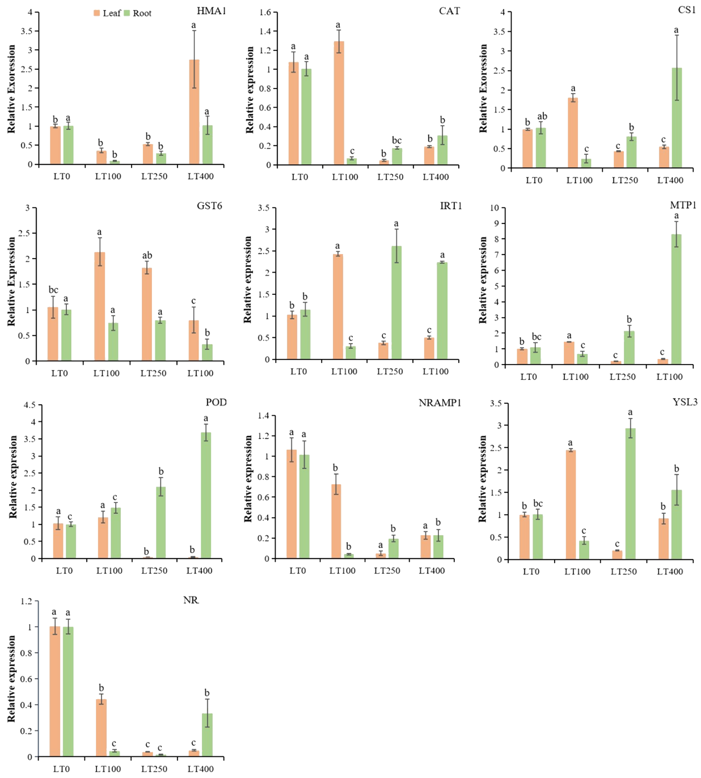 Relative expression levels of known divalent heavy metal ion transporter genes, Cd-resistance genes, and antioxidant enzyme genes in roots and leaves of kenaf under different Cd treatments. The X-axis depicts different Cd concentrations as LT0, LT100, LT250, and LT400. The bars represent the mean standard error (n = 3). Significant differences between treatments at p ≤ 0.05 are indicated by different lowercase letters.