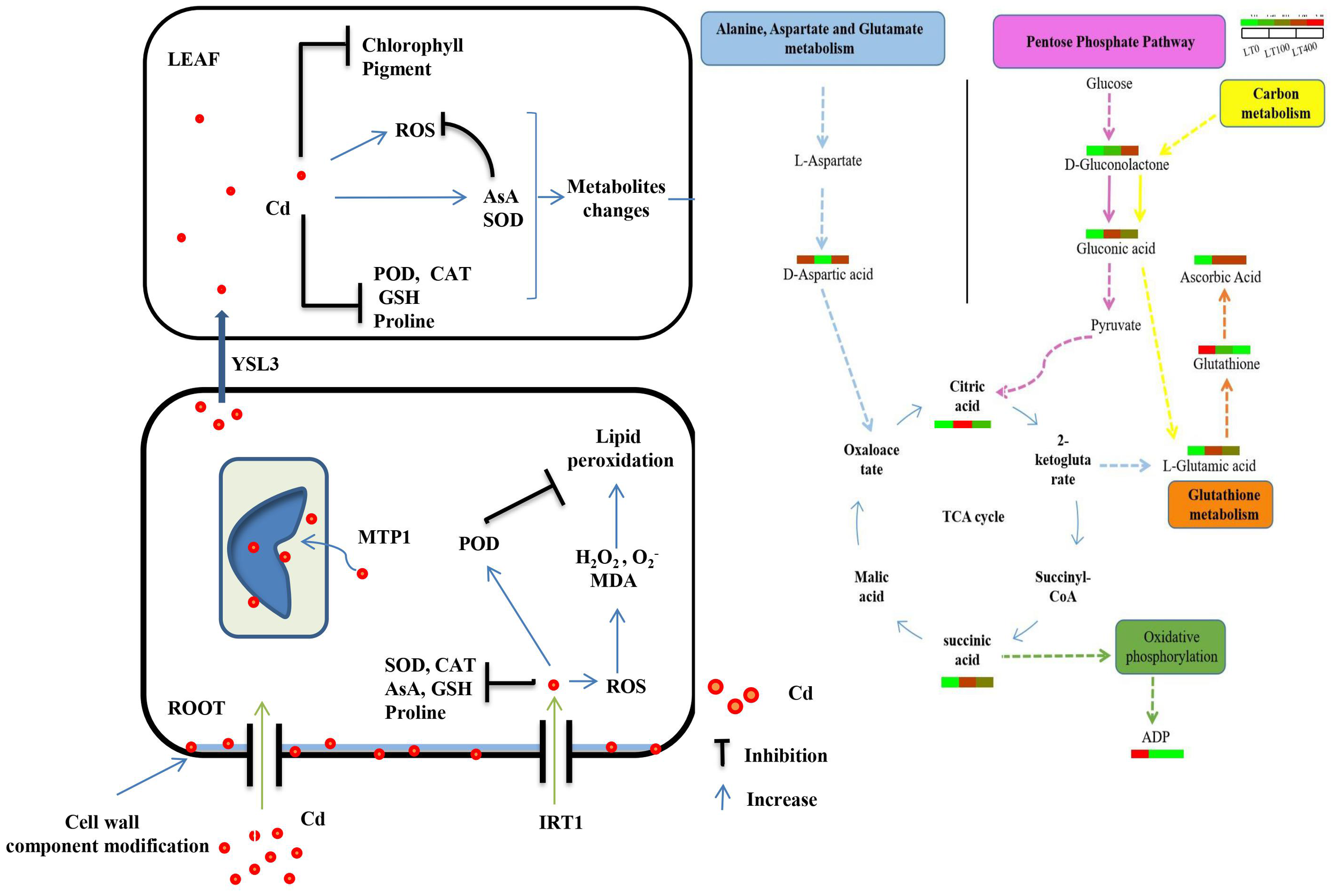 Glutathione and ascorbic acid are important components of the cellular antioxidant defense mechanism that regulates ROS and is involved in the sequestration of heavy metals (Dewhirst and Fry, 2018). Ascorbic acid content increased in both Cd treatments compared to LT0, whereas glutathione content decreased, consistent with physiological observations indicating that ascorbate plays an important role in enhancing kenaf resistance to Cd stress. Amino acids efficiently form complexes with metal ions in the cytoplasm, hence mitigating the adverse impacts of heavy metals on plants (Singh et al., 2016). Glutamic acid belongs to the α-ketoglutarate group of amino acids and is required for various metabolic processes, including alanine, aspartate, and glutamate metabolism, glutathione metabolism, and carbon metabolism. As a precursor of proline and arginine, glutamic acid provides a link between amino acids and respiratory metabolism (Ali et al., 2019). Previously, increased accumulation of glutamic acid was reported in water and salt stress Glycine max and Sporobolus stapfianus, respectively (Martinelli et al., 2007; Farhangi-Abriz and Ghassemi-Golezani, 2016). In this study, proline content increased only in the low Cd treatment group compared to LT0, which could be related to the promotion of glutamic acid that occurred only in the low Cd treatment group. Aspartic acid, a member of the oxaloacetate family of amino acids, is also differentially accumulated in response to Cd stress. This amino acid is essential to nitrogen and carbon metabolism, thereby participating in various metabolic pathways including the synthesis of other amino acids, nucleotides, and organic acids within the TCA cycle, as well as the production of sugars in glycolysis and hormones, all of which are indispensable for the growth and stress tolerance of plants (Ali et al., 2019).